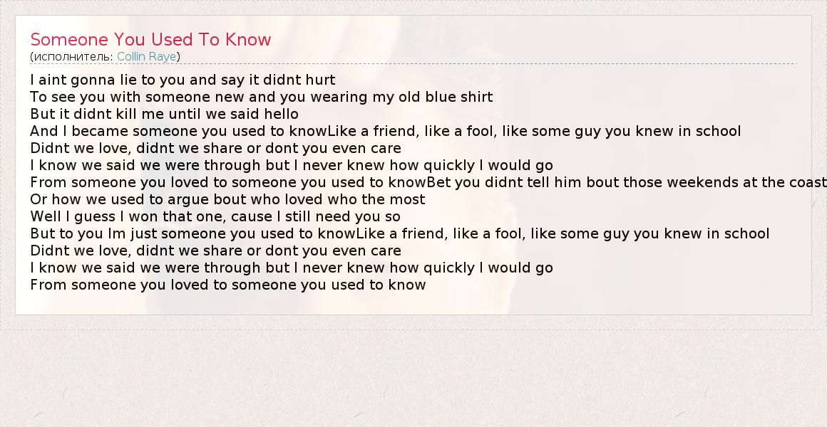 I aint gonna lie to you and say it didnt hurt To see you with someone new and you wearing my old blue shirt But it didnt kill me until we said hello And I became someone you used to knowLike a friend, like a fool, like some guy you knew in school Didnt we love, didnt we share or dont you even care I know we said we were through but I never knew how quickly I would go From someone you loved to someone you used to knowBet you didnt tell him bout those weekends at the coast Or how we used to argue bout who loved who the most Well I guess I won that one, cause I still need you so But to you Im just someone you used to knowLike a friend, like a fool, like some guy you knew in school Didnt we love, didnt we share or dont you even care I know we said we were through but I never knew how quickly I would go From someone you loved to someone you used to know