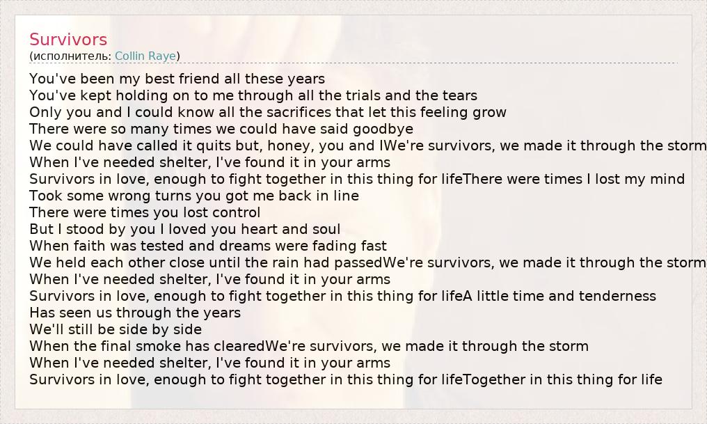 You've been my best friend all these years You've kept holding on to me through all the trials and the tears Only you and I could know all the sacrifices that let this feeling grow There were so many times we could have said goodbye We could have called it quits but, honey, you and IWe're survivors, we made it through the storm When I've needed shelter, I've found it in your arms Survivors in love, enough to fight together in this thing for lifeThere were times I lost my mind Took some wrong turns you got me back in line There were times you lost control But I stood by you I loved you heart and soul When faith was tested and dreams were fading fast We held each other close until the rain had passedWe're survivors, we made it through the storm When I've needed shelter, I've found it in your arms Survivors in love, enough to fight together in this thing for lifeA little time and tenderness Has seen us through the years We'll still be side by side When the final smoke has clearedWe're survivors, we made it through the storm When I've needed shelter, I've found it in your arms Survivors in love, enough to fight together in this thing for lifeTogether in this thing for life