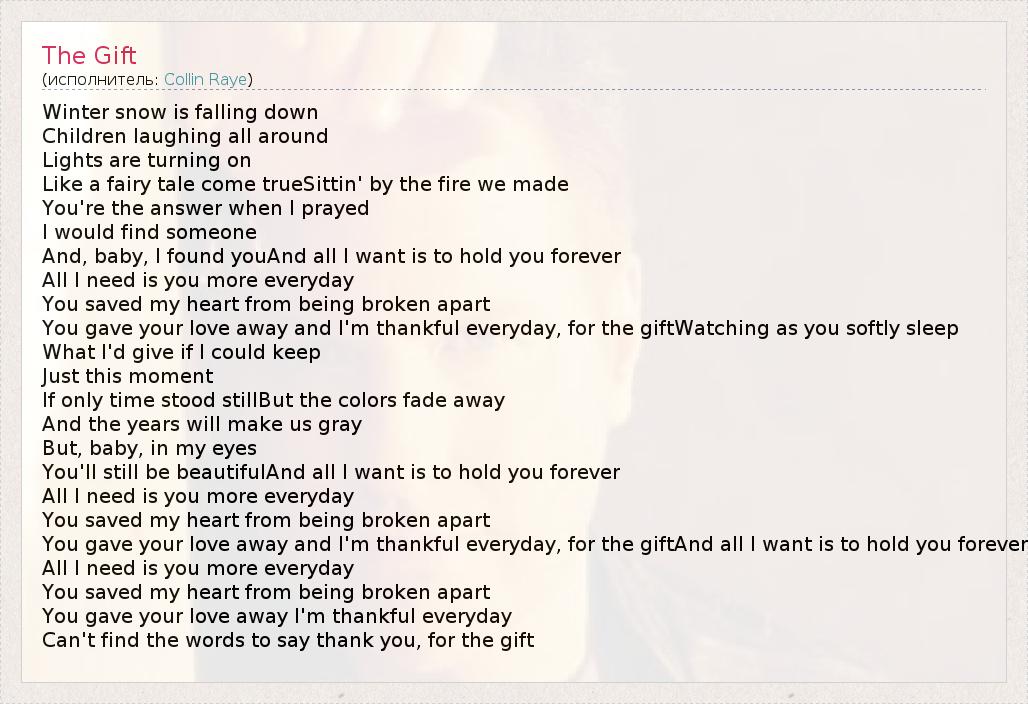 Winter snow is falling down Children laughing all around Lights are turning on Like a fairy tale come trueSittin' by the fire we made You're the answer when I prayed I would find someone And, baby, I found youAnd all I want is to hold you forever All I need is you more everyday You saved my heart from being broken apart You gave your love away and I'm thankful everyday, for the giftWatching as you softly sleep What I'd give if I could keep Just this moment If only time stood stillBut the colors fade away And the years will make us gray But, baby, in my eyes You'll still be beautifulAnd all I want is to hold you forever All I need is you more everyday You saved my heart from being broken apart You gave your love away and I'm thankful everyday, for the giftAnd all I want is to hold you forever All I need is you more everyday You saved my heart from being broken apart You gave your love away I'm thankful everyday Can't find the words to say thank you, for the gift