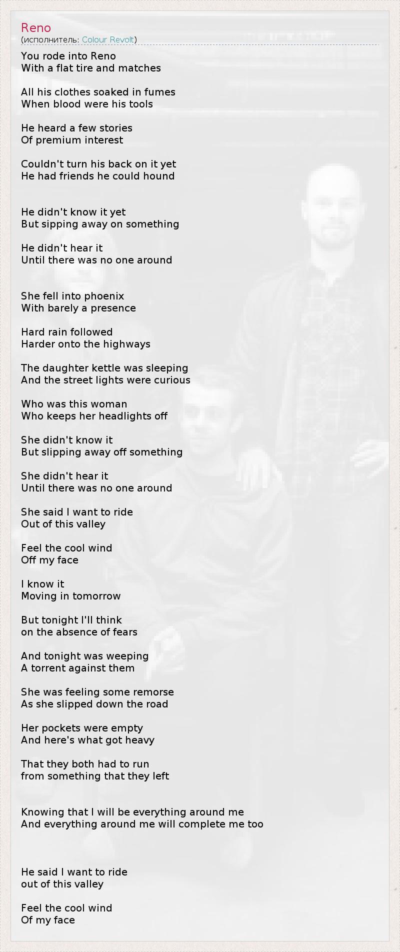 You rode into Reno With a flat tire and matches All his clothes soaked in fumes When blood were his tools He heard a few stories Of premium interest Couldn't turn his back on it yet He had friends he could hound He didn't know it yet But sipping away on something He didn't hear it Until there was no one around She fell into phoenix With barely a presence Hard rain followed Harder onto the highways The daughter kettle was sleeping And the street lights were curious Who was this woman Who keeps her headlights off She didn't know it But slipping away off something She didn't hear it Until there was no one around She said I want to ride Out of this valley Feel the cool wind Off my face I know it Moving in tomorrow But tonight I'll think on the absence of fears And tonight was weeping A torrent against them She was feeling some remorse As she slipped down the road Her pockets were empty And here's what got heavy That they both had to run from something that they left Knowing that I will be everything around me And everything around me will complete me too He said I want to ride out of this valley Feel the cool wind Of my face