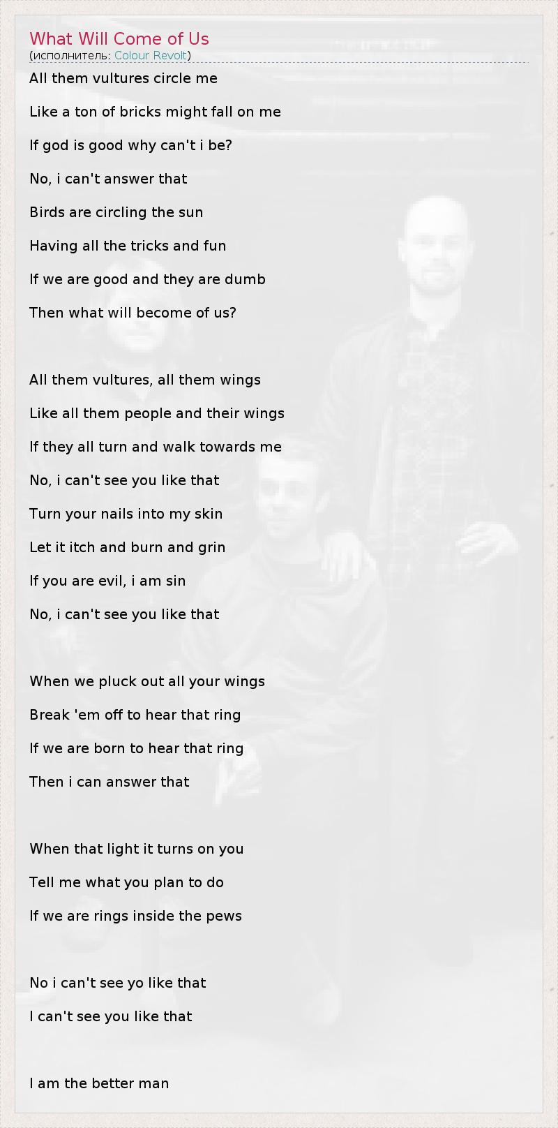 А как ты думаешь, о чем песня "What Will Come of Us" ?