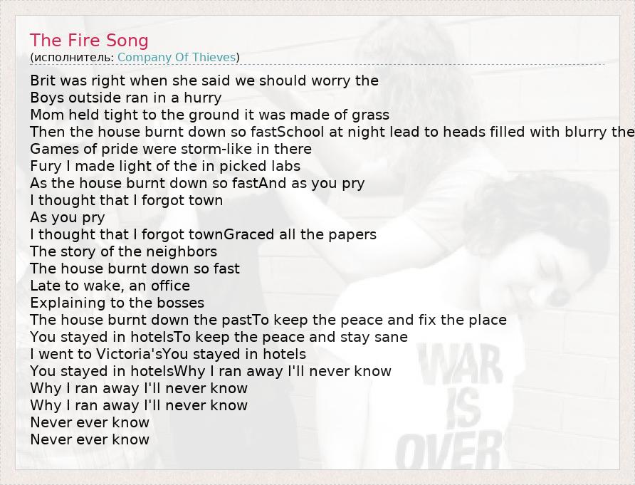 Brit was right when she said we should worry the Boys outside ran in a hurry Mom held tight to the ground it was made of grass Then the house burnt down so fastSchool at night lead to heads filled with blurry the Games of pride were storm-like in there Fury I made light of the in picked labs As the house burnt down so fastAnd as you pry I thought that I forgot town As you pry I thought that I forgot townGraced all the papers The story of the neighbors The house burnt down so fast Late to wake, an office Explaining to the bosses The house burnt down the pastTo keep the peace and fix the place You stayed in hotelsTo keep the peace and stay sane I went to Victoria'sYou stayed in hotels You stayed in hotelsWhy I ran away I'll never know Why I ran away I'll never know Why I ran away I'll never know Never ever know Never ever know