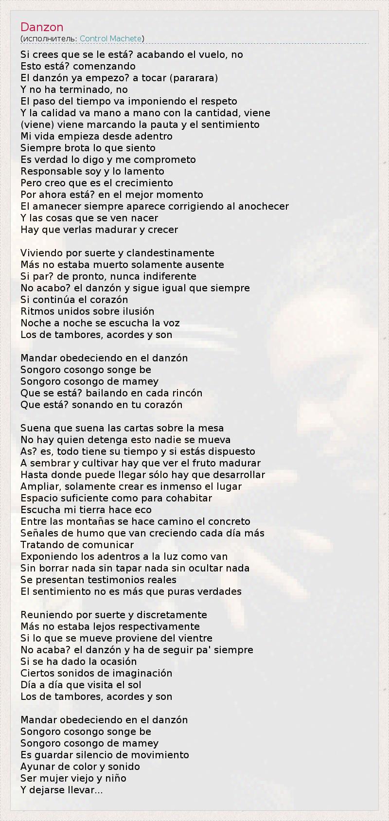 Это интересно:Control Machete – мексиканская хип-хоп-группа из г. Монтеррей, Нуэво-Леон, Мексика. В состав группы входят: Fermin IV, Patricio "Pato" Chapa Elizalde и Toy Kenobi (Toy Hernández). Однако, Fermin IV покинул группу в 2002 году и выпустил сольный альбом – Boomerang. Он также сотрудничал с Cypress Hill в песне "Siempre Peligroso", включенной в альбом Los... продолжение