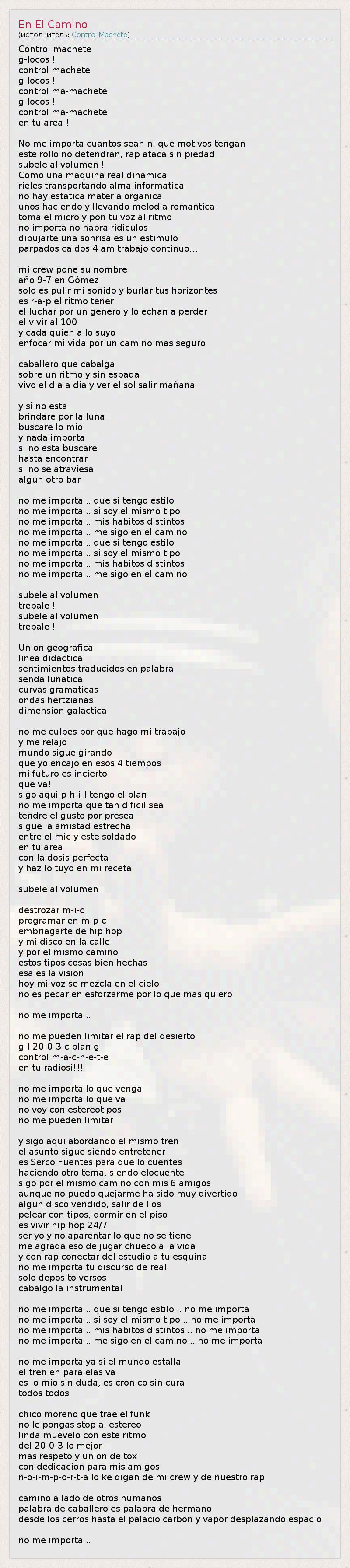 Это интересно:Control Machete – мексиканская хип-хоп-группа из г. Монтеррей, Нуэво-Леон, Мексика. В состав группы входят: Fermin IV, Patricio "Pato" Chapa Elizalde и Toy Kenobi (Toy Hernández). Однако, Fermin IV покинул группу в 2002 году и выпустил сольный альбом – Boomerang. Он также сотрудничал с Cypress Hill в песне "Siempre Peligroso", включенной в альбом Los... продолжение