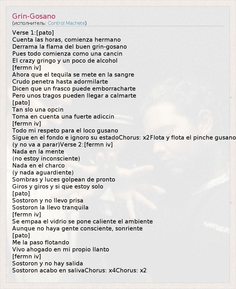 Verse 1:[pato] Cuenta las horas, comienza hermano Derrama la flama del buen grin-gosano Pues todo comienza como una cancin El crazy gringo y un poco de alcohol [fermn iv] Ahora que el tequila se mete en la sangre Crudo penetra hasta adormilarte Dicen que un frasco puede emborracharte Pero unos tragos pueden llegar a calmarte [pato] Tan slo una opcin Toma en cuenta una fuerte adiccin [fermn iv] Todo mi respeto para el loco gusano Sigue en el fondo e ignoro su estadoChorus: x2Flota y flota el pinche gusano (y no va a parar)Verse 2:[fermn iv] Nada en la mente (no estoy inconsciente) Nada en el charco (y nada aguardiente) Sombras y luces golpean de pronto Giros y giros y si que estoy solo [pato] Sostoron y no llevo prisa Sostoron la llevo tranquila [fermn iv] Se empaa el vidrio se pone caliente el ambiente Aunque no haya gente consciente, sonriente [pato] Me la paso flotando Vivo ahogado en mi propio llanto [fermn iv] Sostoron y no hay salida Sostoron acabo en salivaChorus: x4Chorus: x2
