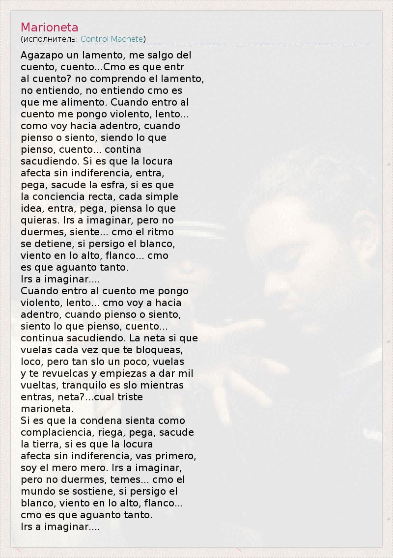 Это интересно:Control Machete – мексиканская хип-хоп-группа из г. Монтеррей, Нуэво-Леон, Мексика. В состав группы входят: Fermin IV, Patricio "Pato" Chapa Elizalde и Toy Kenobi (Toy Hernández). Однако, Fermin IV покинул группу в 2002 году и выпустил сольный альбом – Boomerang. Он также сотрудничал с Cypress Hill в песне "Siempre Peligroso", включенной в альбом Los... продолжение