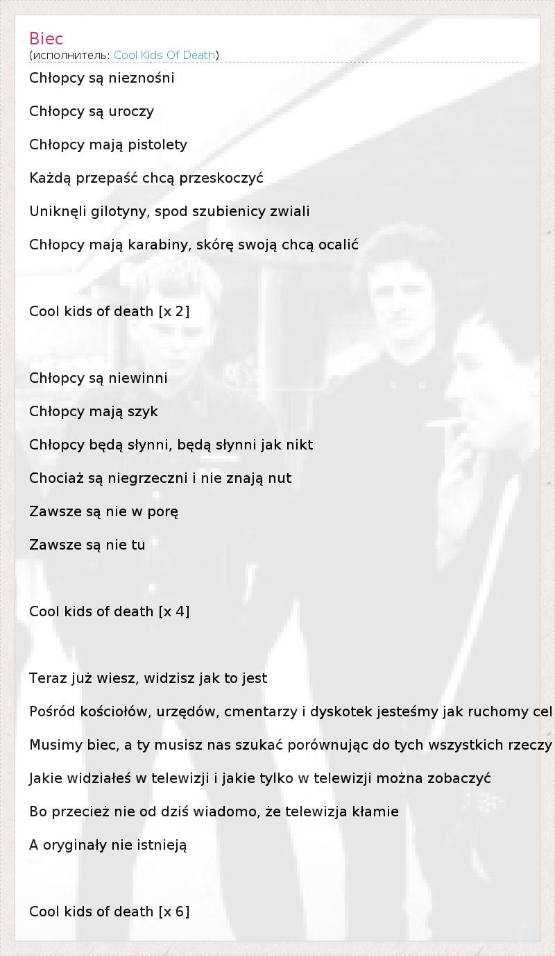 Это интересно:Cool Kids Of Death, группа основана в 2001 году в Лодзи.Название происходит от песни британской группы Saint Etienne.Их музыка характеризуется резким звуком панк-гитары, электронными компонентами, высокой бас гитарой (играет Якуб Вандахович) и очень крикливым вокалом.Участники группы:- Кшиштоф Островский - вокал, дизайнер, модельер, автор видео, карикатурист (иллюстрации к книге Дороти... продолжение