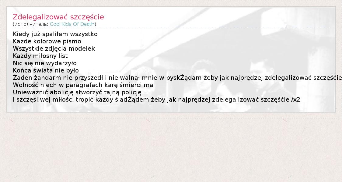 Kiedy już spaliłem wszystko Każde kolorowe pismo Wszystkie zdjęcia modelek Każdy miłosny list Nic się nie wydarzyło Końca świata nie było Żaden żandarm nie przyszedł i nie walnął mnie w pyskŻądam żeby jak najprędzej zdelegalizować szczęśćie Wolność niech w paragrafach karę śmierci ma Unieważnić abolicję stworzyć tajną policję I szczęśliwej miłości tropić każdy śladŻądem żeby jak najprędzej zdelegalizować szczęśćie /x2