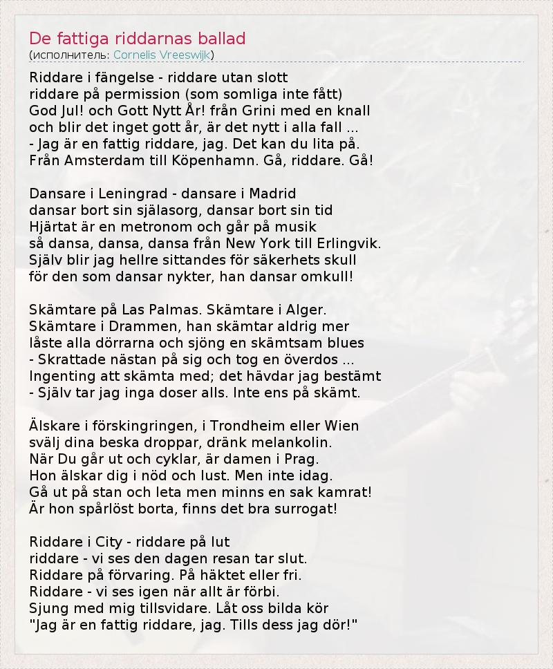Riddare i fängelse - riddare utan slott riddare på permission (som somliga inte fått) God Jul! och Gott Nytt År! från Grini med en knall och blir det inget gott år, är det nytt i alla fall ... - Jag är en fattig riddare, jag. Det kan du lita på. Från Amsterdam till Köpenhamn. Gå, riddare. Gå! Dansare i Leningrad - dansare i Madrid dansar bort sin själasorg, dansar bort sin tid Hjärtat är en metronom och går på musik så dansa, dansa, dansa från New York till Erlingvik. Själv blir jag hellre sittandes för säkerhets skull för den som dansar nykter, han dansar omkull! Skämtare på Las Palmas. Skämtare i Alger. Skämtare i Drammen, han skämtar aldrig mer låste alla dörrarna och sjöng en skämtsam blues - Skrattade nästan på sig och tog en överdos ... Ingenting att skämta med; det hävdar jag bestämt - Själv tar jag inga doser alls. Inte ens på skämt. Älskare i förskingringen, i Trondheim eller Wien svälj dina beska droppar, dränk melankolin. När Du går ut och cyklar, är damen i Prag. Hon älskar dig i nöd och lust. Men inte idag. Gå ut på stan och leta men minns en sak kamrat! Är hon spårlöst borta, finns det bra surrogat! Riddare i City - riddare på lut riddare - vi ses den dagen resan tar slut. Riddare på förvaring. På häktet eller fri. Riddare - vi ses igen när allt är förbi. Sjung med mig tillsvidare. Låt oss bilda kör "Jag är en fattig riddare, jag. Tills dess jag dör!"