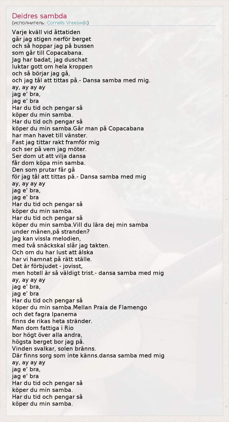 Varje kväll vid åttatiden går jag stigen nerför berget och så hoppar jag på bussen som går till Copacabana. Jag har badat, jag duschat luktar gott om hela kroppen och så börjar jag gå, och jag tål att tittas på.- Dansa samba med mig. ay, ay ay ay jag e' bra, jag e' bra Har du tid och pengar så köper du min samba. Har du tid och pengar så köper du min samba.Går man på Copacabana har man havet till vänster. Fast jag tittar rakt framför mig och ser på vem jag möter. Ser dom ut att vilja dansa får dom köpa min samba. Den som prutar får gå för jag tål att tittas på.- Dansa samba med mig ay, ay ay ay jag e' bra, jag e' bra Har du tid och pengar så köper du min samba. Har du tid och pengar så köper du min samba.Vill du lära dej min samba under månen,på stranden? Jag kan vissla melodien, med två snäckskal slår jag takten. Och om du har lust att älska har vi hamnat på rätt ställe. Det är förbjudet - jovisst, men hotell är så väldigt trist.- dansa samba med mig ay, ay ay ay jag e' bra, jag e' bra Har du tid och pengar så köper du min samba.Mellan Praia de Flamengo och det fagra Ipanema finns de rikas heta stränder. Men dom fattiga i Rio bor högt över alla andra, högsta berget bor jag på. Vinden svalkar, solen bränns. Där finns sorg som inte känns.dansa samba med mig ay, ay ay ay jag e' bra, jag e' bra Har du tid och pengar så köper du min samba. Har du tid och pengar så köper du min samba.