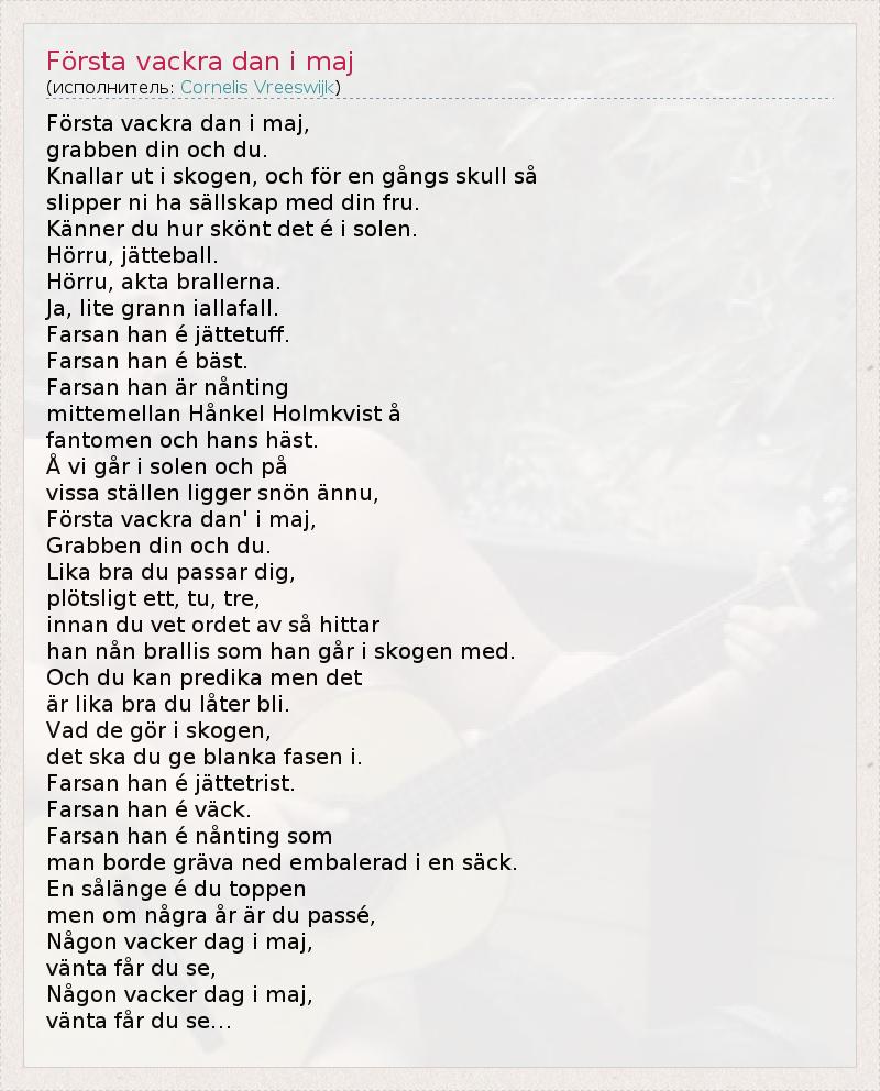 Första vackra dan i maj, grabben din och du. Knallar ut i skogen, och för en gångs skull så slipper ni ha sällskap med din fru. Känner du hur skönt det é i solen. Hörru, jätteball. Hörru, akta brallerna. Ja, lite grann iallafall. Farsan han é jättetuff. Farsan han é bäst. Farsan han är nånting mittemellan Hånkel Holmkvist å fantomen och hans häst. Å vi går i solen och på vissa ställen ligger snön ännu, Första vackra dan' i maj, Grabben din och du. Lika bra du passar dig, plötsligt ett, tu, tre, innan du vet ordet av så hittar han nån brallis som han går i skogen med. Och du kan predika men det är lika bra du låter bli. Vad de gör i skogen, det ska du ge blanka fasen i. Farsan han é jättetrist. Farsan han é väck. Farsan han é nånting som man borde gräva ned embalerad i en säck. En sålänge é du toppen men om några år är du passé, Någon vacker dag i maj, vänta får du se, Någon vacker dag i maj, vänta får du se…