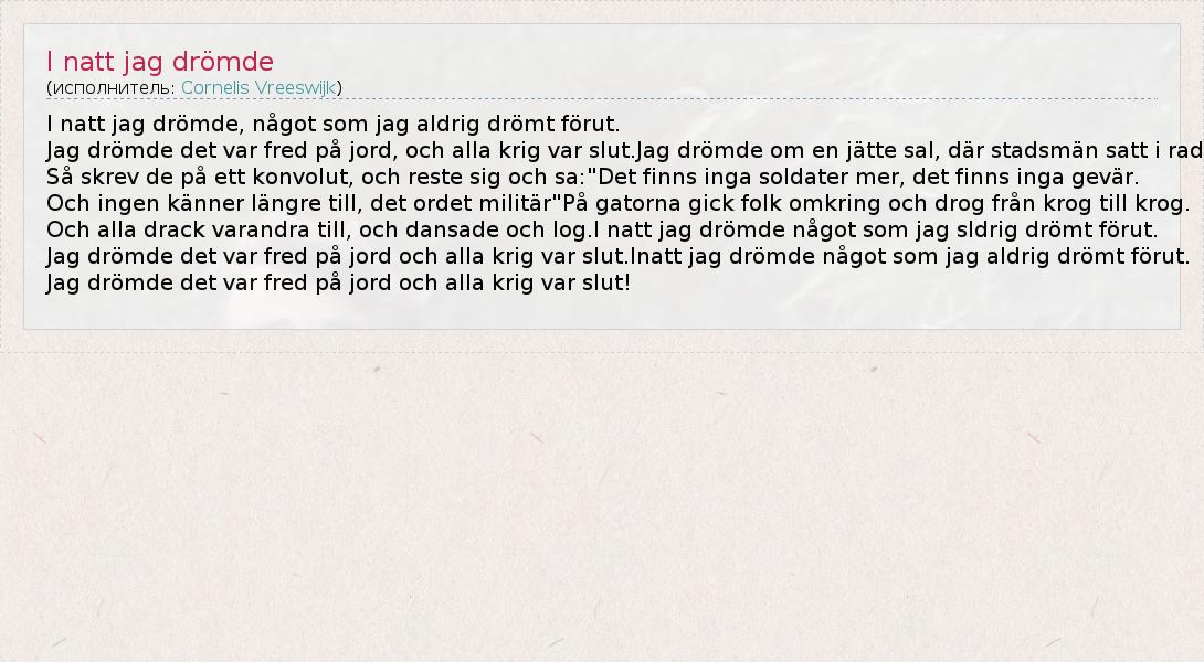 I natt jag drömde, något som jag aldrig drömt förut. Jag drömde det var fred på jord, och alla krig var slut.Jag drömde om en jätte sal, där stadsmän satt i rad Så skrev de på ett konvolut, och reste sig och sa:"Det finns inga soldater mer, det finns inga gevär. Och ingen känner längre till, det ordet militär"På gatorna gick folk omkring och drog från krog till krog. Och alla drack varandra till, och dansade och log.I natt jag drömde något som jag sldrig drömt förut. Jag drömde det var fred på jord och alla krig var slut.Inatt jag drömde något som jag aldrig drömt förut. Jag drömde det var fred på jord och alla krig var slut!