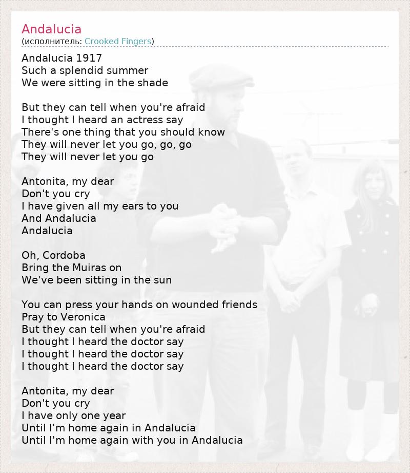 Andalucia 1917 Such a splendid summer We were sitting in the shade But they can tell when you're afraid I thought I heard an actress say There's one thing that you should know They will never let you go, go, go They will never let you go Antonita, my dear Don't you cry I have given all my ears to you And Andalucia Andalucia Oh, Cordoba Bring the Muiras on We've been sitting in the sun You can press your hands on wounded friends Pray to Veronica But they can tell when you're afraid I thought I heard the doctor say I thought I heard the doctor say I thought I heard the doctor say Antonita, my dear Don't you cry I have only one year Until I'm home again in Andalucia Until I'm home again with you in Andalucia