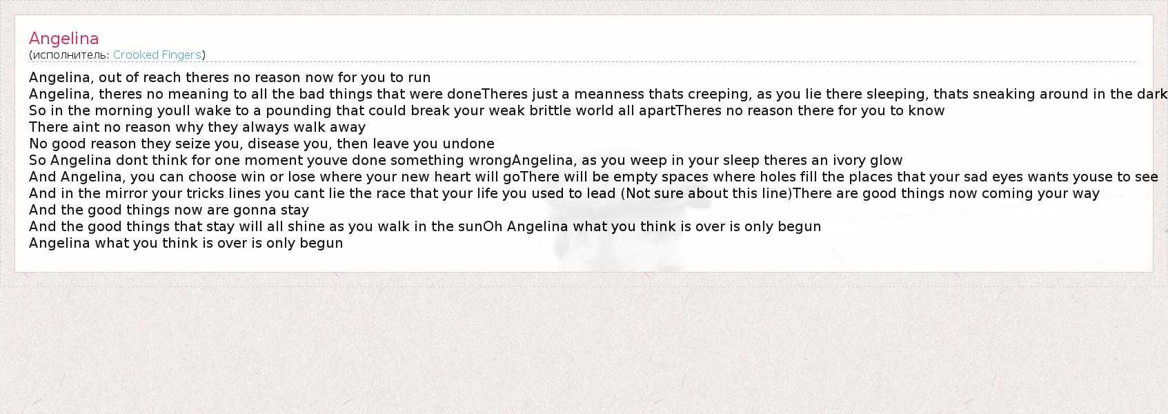 Angelina, out of reach theres no reason now for you to run Angelina, theres no meaning to all the bad things that were doneTheres just a meanness thats creeping, as you lie there sleeping, thats sneaking around in the dark So in the morning youll wake to a pounding that could break your weak brittle world all apartTheres no reason there for you to know There aint no reason why they always walk away No good reason they seize you, disease you, then leave you undone So Angelina dont think for one moment youve done something wrongAngelina, as you weep in your sleep theres an ivory glow And Angelina, you can choose win or lose where your new heart will goThere will be empty spaces where holes fill the places that your sad eyes wants youse to see And in the mirror your tricks lines you cant lie the race that your life you used to lead (Not sure about this line)There are good things now coming your way And the good things now are gonna stay And the good things that stay will all shine as you walk in the sunOh Angelina what you think is over is only begun Angelina what you think is over is only begun