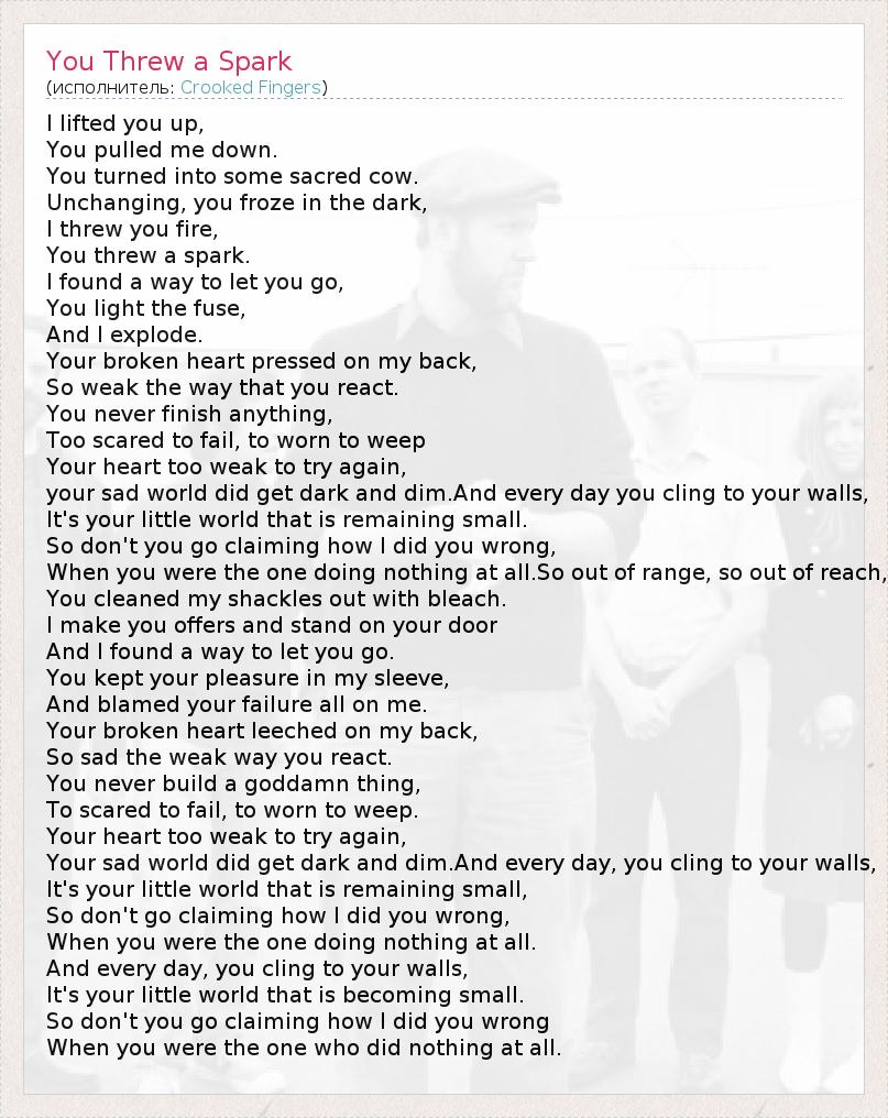 А как ты думаешь, о чем песня "You Threw a Spark" ?