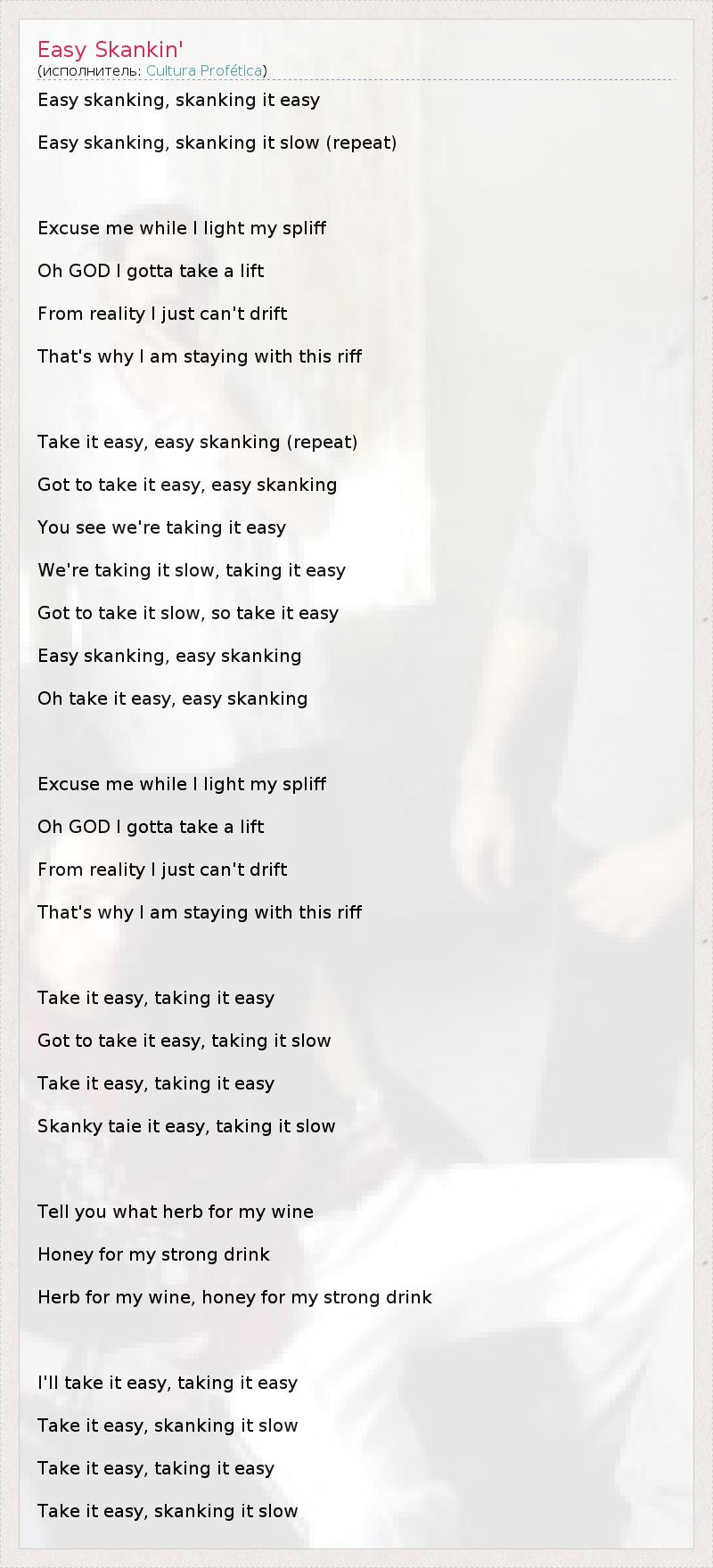 Easy skanking, skanking it easy Easy skanking, skanking it slow (repeat) Excuse me while I light my spliff Oh GOD I gotta take a lift From reality I just can't drift That's why I am staying with this riff Take it easy, easy skanking (repeat) Got to take it easy, easy skanking You see we're taking it easy We're taking it slow, taking it easy Got to take it slow, so take it easy Easy skanking, easy skanking Oh take it easy, easy skanking Excuse me while I light my spliff Oh GOD I gotta take a lift From reality I just can't drift That's why I am staying with this riff Take it easy, taking it easy Got to take it easy, taking it slow Take it easy, taking it easy Skanky taie it easy, taking it slow Tell you what herb for my wine Honey for my strong drink Herb for my wine, honey for my strong drink I'll take it easy, taking it easy Take it easy, skanking it slow Take it easy, taking it easy Take it easy, skanking it slow