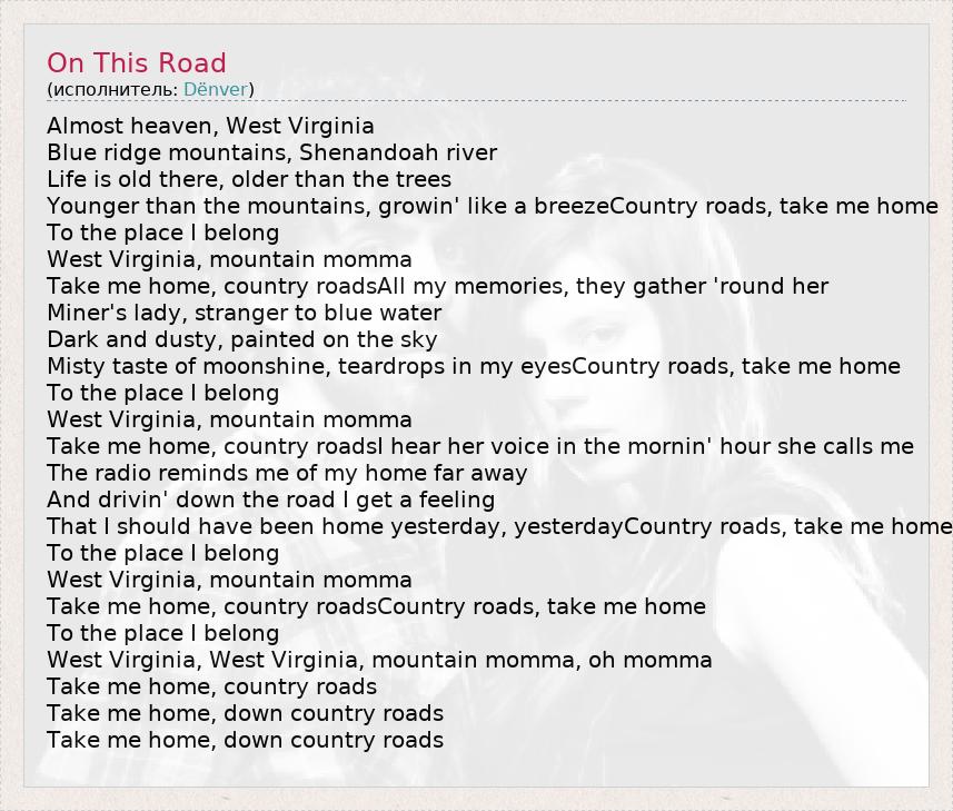Take me home, country roadsCountry roads, take me home