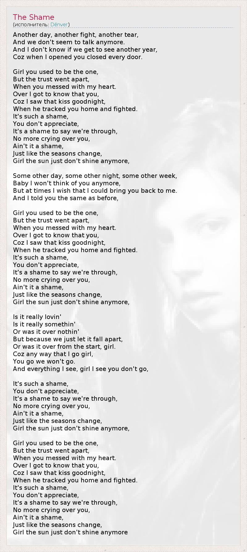 Ещё один день, ещё одна схватка, очередная слеза. Кажется, мы вообще не общаемся. И не уверен, будем ли вместе в следующем году, Потому что, когда я открываю, ты закрываешь все двери. Малыш, ты была единственной, Но доверие ушло куда-то, Когда ты разорвала нашу связь. Когда я понял, кто ты, Потому что видел этот поцелуй ‘на прощание’, Когда он подвозил тебя до дома и дрался. Это такой позор. Ты не понимаешь… Это позор - сказать, что между нами всё кончено… Больше никаких слёз из-за тебя. И вовсе это не позор, Просто время года сменилось, И солнце больше не сияет. Ещё один день, ещё одна ночь, ещё одна неделя. Малыш, я больше не думаю о тебе, Но временами мечтаю вернуть тебя И говорю тоже, что и ранее. Малыш, ты была единственной, Но доверие ушло куда-то, Когда ты разорвала нашу связь. Когда я понял, кто ты, Потому что видел этот поцелуй ‘на прощание’, Когда он подвозил тебя до дома и дрался. Это такой позор. Ты не понимаешь… Это позор - сказать, что между нами всё кончено… Больше никаких слёз из-за тебя. И вовсе это не позор, Просто время года сменилось, И солнце больше не сияет. Это действительно влюблённость? Это действительно что-то большее? Или всё это было пустяком? Но поскольку мы пустили всё на самотёк, Или всё начали с нуля? Потому что любой путь, по которому я иду, малыш, Это твой путь, но вдвоём там делать нечего. И всё, что я вижу и делаю, ты делаешь наоборот. Это такой позор. Ты не понимаешь… Это позор - сказать, что между нами всё кончено… Больше никаких слёз из-за тебя. И вовсе это не позор, Просто время года сменилось, И солнце больше не сияет. Малыш, ты была единственной, Но доверие ушло куда-то, Когда ты разорвала нашу связь. Когда я понял, кто ты, Потому что видел этот поцелуй ‘на прощание’, Когда он подвозил тебя до дома и дрался. Это такой позор. Ты не понимаешь… Это позор - сказать, что между нами всё кончено… Больше никаких слёз из-за тебя. И вовсе это не позор, Просто время года сменилось, И солнце больше не сияет.