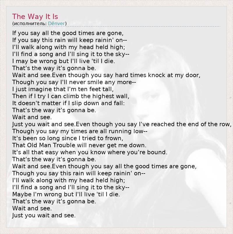 If you say all the good times are gone, If you say this rain will keep rainin' on-- I'll walk along with my head held high; I'll find a song and I'll sing it to the sky-- I may be wrong but I'll live 'til I die. That's the way it's gonna be. Wait and see.Even though you say hard times knock at my door, Though you say I'll never smile any more-- I just imagine that I'm ten feet tall, Then if I try I can climb the highest wall, It doesn't matter if I slip down and fall: That's the way it's gonna be. Wait and see. Just you wait and see.Even though you say I've reached the end of the row, Though you say my times are all running low-- It's been so long since I tried to frown, That Old Man Trouble will never get me down. It's all that easy when you know where you're bound. That's the way it's gonna be. Wait and see.Even though you say all the good times are gone, Though you say this rain will keep rainin' on-- I'll walk along with my head held high; I'll find a song and I'll sing it to the sky-- Maybe I'm wrong but I'll live 'til I die. That's the way it's gonna be. Wait and see. Just you wait and see.