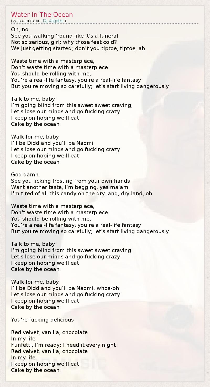 Oh, no See you walking 'round like it's a funeral Not so serious, girl; why those feet cold? We just getting started; don't you tiptoe, tiptoe, ah Waste time with a masterpiece, Don't waste time with a masterpiece You should be rolling with me, You're a real-life fantasy, you're a real-life fantasy But you're moving so carefully; let's start living dangerously Talk to me, baby I'm going blind from this sweet sweet craving, Let's lose our minds and go fucking crazy I keep on hoping we'll eat Cake by the ocean Walk for me, baby I'll be Didd and you'll be Naomi Let's lose our minds and go fucking crazy I keep on hoping we'll eat Cake by the ocean God damn See you licking frosting from your own hands Want another taste, I'm begging, yes ma'am I'm tired of all this candy on the dry land, dry land, oh Waste time with a masterpiece, Don't waste time with a masterpiece You should be rolling with me, You're a real-life fantasy, you're a real-life fantasy But you're moving so carefully; let's start living dangerously Talk to me, baby I'm going blind from this sweet sweet craving Let's lose our minds and go fucking crazy I keep on hoping we'll eat Cake by the ocean Walk for me, baby I'll be Didd and you'll be Naomi, whoa-oh Let's lose our minds and go fucking crazy I keep on hoping we'll eat Cake by the ocean You're fucking delicious Red velvet, vanilla, chocolate In my life Funfetti, I'm ready; I need it every night Red velvet, vanilla, chocolate In my life I keep on hoping we'll eat Cake by the ocean