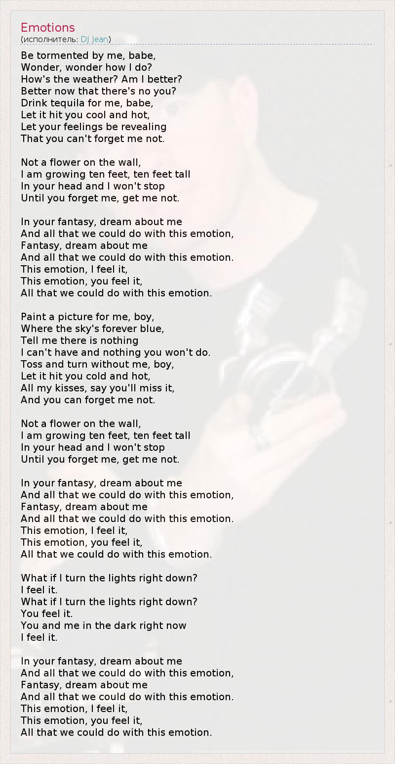 Я замучаю тебя, крошка. Интересно, интересно, как я поживаю? Как погода? Мне стало лучше? Лучше, когда тебя здесь нет? Выпей за меня текилы, крошка, Пусть от неё тебя бросит в жар и в холод, Пусть твои чувства выдадут, Что ты не в силах забыть меня. Не цветок на стене, Я расту всё выше, я возвышаюсь У тебя в голове, и я не остановлюсь, Пока ты не забудешь меня. В своих фантазиях мечтаешь обо мне И обо всём, что мы могли бы сделать с этой эмоцией, Фантазии, мечтаешь обо мне И обо всём, что мы могли бы сделать с этой эмоцией. Эта эмоция, я испытываю её, Эта эмоция, ты испытываешь её, Всё, что мы могли бы сделать с этой эмоцией. Нарисуй для меня картину, парень, На которой небо всегда пасмурное, Скажи, что ничего я не Получу, а ты ничего не сделаешь. Без меня ты ворочаешься, парень, Пусть тебя бросит в жар и в холод, Мои поцелуи, скажи, что скучаешь по ним И ты не в силах забыть меня. Не цветок на стене, Я расту всё выше, я возвышаюсь У тебя в голове, и я не остановлюсь, Пока ты не забудешь меня. В своих фантазиях мечтаешь обо мне И обо всём, что мы могли бы сделать с этой эмоцией, Фантазии, мечтаешь обо мне И обо всём, что мы могли бы сделать с этой эмоцией. Эта эмоция, я испытываю её, Эта эмоция, ты испытываешь её, Всё, что мы могли бы сделать с этой эмоцией. А что если я погашу свет? Я чувствую. А что если я погашу свет? Ты чувствуешь. Теперь ты и я в темноте, Я чувствую. В своих фантазиях мечтаешь обо мне И обо всём, что мы могли бы сделать с этой эмоцией, Фантазии, мечтаешь обо мне И обо всём, что мы могли бы сделать с этой эмоцией. Эта эмоция, я испытываю её, Эта эмоция, ты испытываешь её, Всё, что мы могли бы сделать с этой эмоцией.