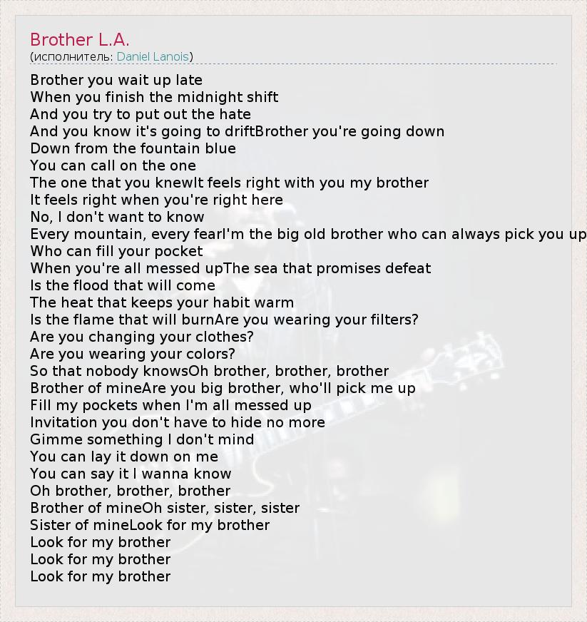Brother you wait up late When you finish the midnight shift And you try to put out the hate And you know it's going to driftBrother you're going down Down from the fountain blue You can call on the one The one that you knewIt feels right with you my brother It feels right when you're right here No, I don't want to know Every mountain, every fearI'm the big old brother who can always pick you up Who can fill your pocket When you're all messed upThe sea that promises defeat Is the flood that will come The heat that keeps your habit warm Is the flame that will burnAre you wearing your filters? Are you changing your clothes? Are you wearing your colors? So that nobody knowsOh brother, brother, brother Brother of mineAre you big brother, who'll pick me up Fill my pockets when I'm all messed up Invitation you don't have to hide no more Gimme something I don't mind You can lay it down on me You can say it I wanna know Oh brother, brother, brother Brother of mineOh sister, sister, sister Sister of mineLook for my brother Look for my brother Look for my brother Look for my brother
