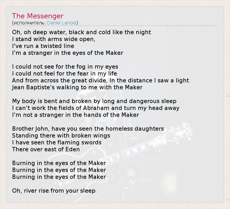 Oh, oh deep water, black and cold like the night I stand with arms wide open, I've run a twisted line I'm a stranger in the eyes of the Maker I could not see for the fog in my eyes I could not feel for the fear in my life And from across the great divide, In the distance I saw a light Jean Baptiste's walking to me with the Maker My body is bent and broken by long and dangerous sleep I can't work the fields of Abraham and turn my head away I'm not a stranger in the hands of the Maker Brother John, have you seen the homeless daughters Standing there with broken wings I have seen the flaming swords There over east of Eden Burning in the eyes of the Maker Burning in the eyes of the Maker Burning in the eyes of the Maker Oh, river rise from your sleep