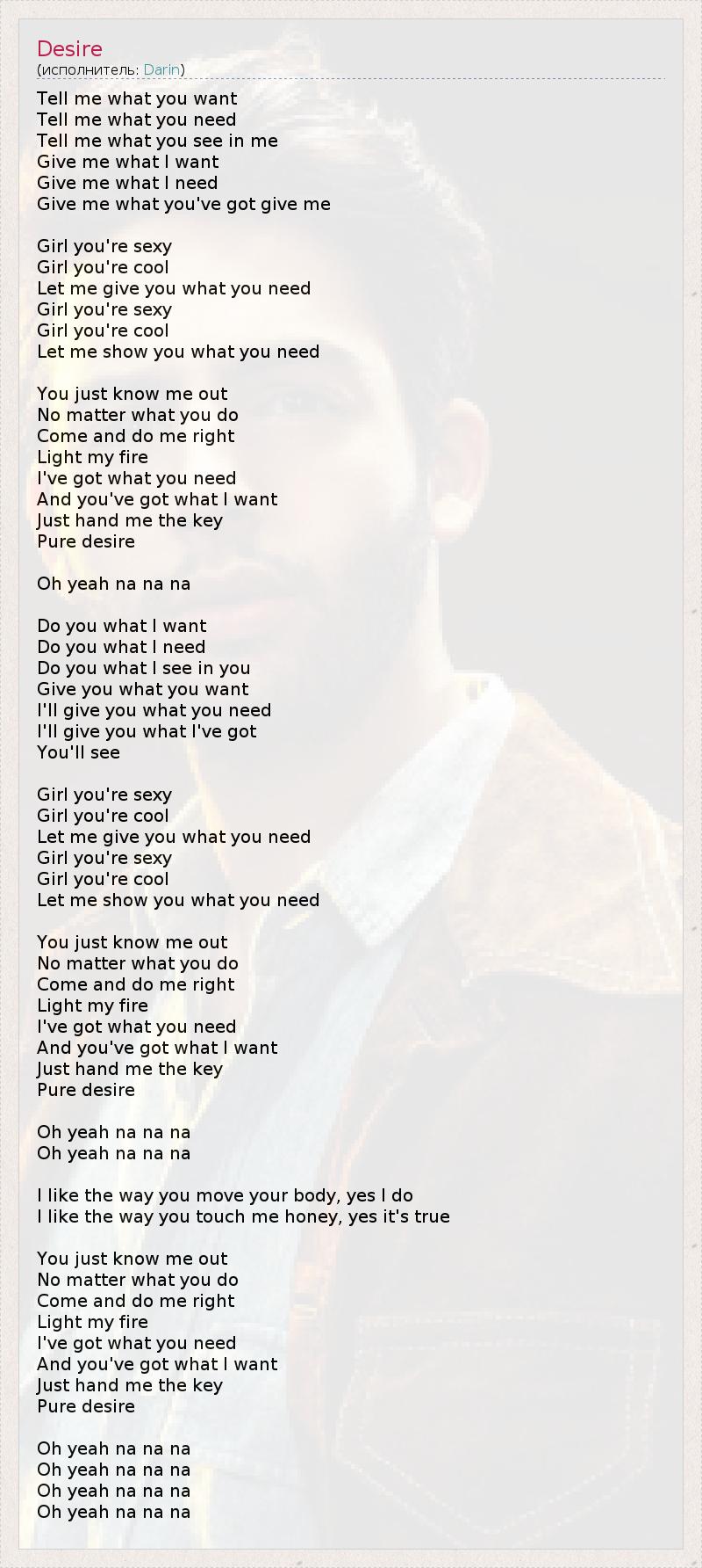 Скажи мне, что ты хочешь, Скажи, что тебе нужно, Скажи, что ты видишь во мне. Дай мне то, что я хочу, Дай то, что мне нужно, Дай мне всё, что ты можешь дать. Детка, ты сексуальна, Детка, ты хороша, Позволь мне дать то, что ты хочешь. Детка, ты сексуальна, Детка, ты хороша, Позволь показать то, что тебе нужно. Ты знаешь меня от и до. Что бы ты ни делала, Подойди и сделай это - Зажги огонь во мне! У меня есть то, что тебе нужно, А у тебя есть то, что нужно мне. Просто дай мне ключ От чистого желания. О, да, на-на-на... Ты - то что я хочу? Ты - та, кто мне нужен? Ты такая, какой я вижу тебя? Я дам тебе то, что ты хочешь, Дам то, что тебе нужно. Я дам тебе то, что я хочу дать, Ты увидишь... Детка, ты сексуальна, Детка, ты хороша, Позволь мне дать то, что ты хочешь. Детка, ты сексуальна, Детка, ты хороша, Позволь показать то, что тебе нужно. Ты знаешь меня от и до. Что бы ты ни делала, Подойди и сделай это - Зажги огонь во мне! У меня есть то, что тебе нужно, А у тебя есть то, что нужно мне. Просто дай мне ключ От чистого желания. О, да, на-на-на О, да, на-на-на Мне нравится, как ты двигаешься, да Мне нравится, когда ты дотрагиваешься до меня, дорогая, это правда. Ты знаешь меня от и до. Что бы ты ни делала, Подойди и сделай это - Зажги огонь во мне! У меня есть то, что тебе нужно, А у тебя есть то, что нужно мне. Просто дай мне ключ От чистого желания. О, да, на-на-на О, да, на-на-на О, да, на-на-на О, да, на-на-на