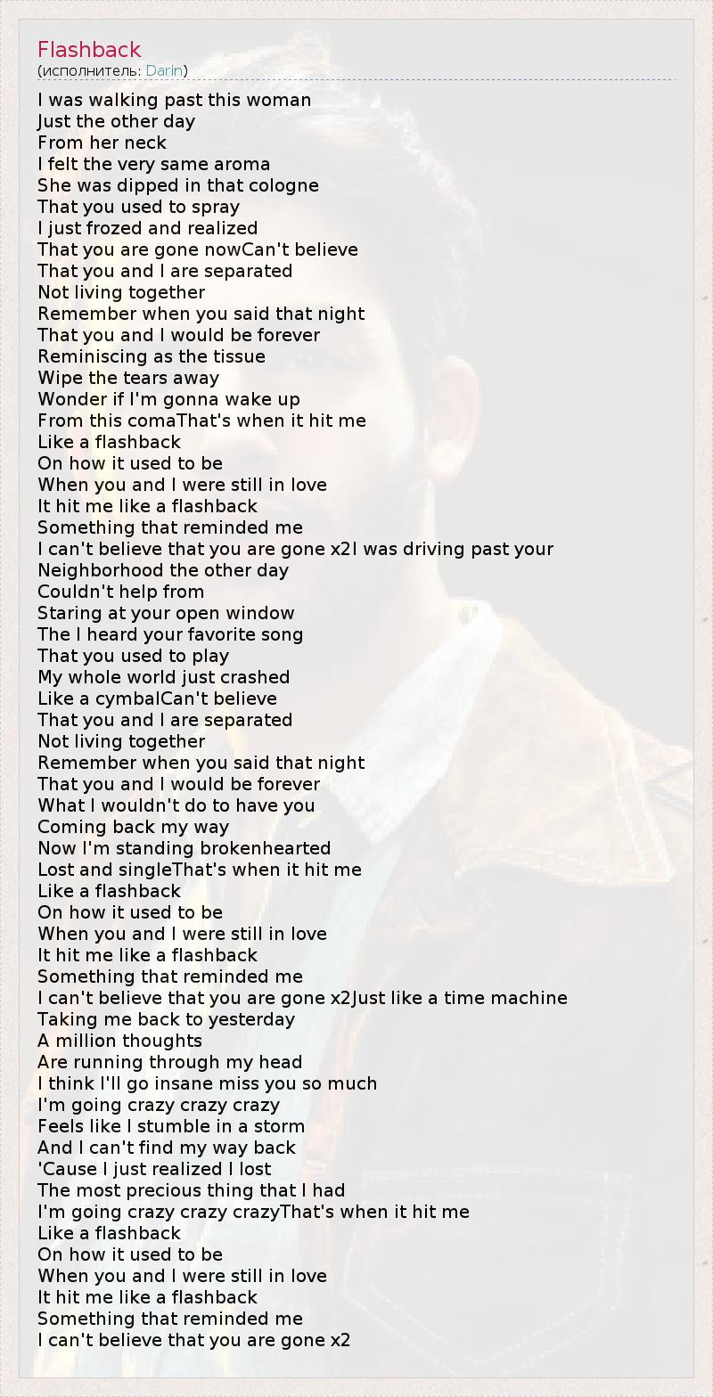 I was walking past this woman Just the other day From her neck I felt the very same aroma She was dipped in that cologne That you used to spray I just frozed and realized That you are gone nowCan't believe That you and I are separated Not living together Remember when you said that night That you and I would be forever Reminiscing as the tissue Wipe the tears away Wonder if I'm gonna wake up From this comaThat's when it hit me Like a flashback On how it used to be When you and I were still in love It hit me like a flashback Something that reminded me I can't believe that you are gone x2I was driving past your Neighborhood the other day Couldn't help from Staring at your open window The I heard your favorite song That you used to play My whole world just crashed Like a cymbalCan't believe That you and I are separated Not living together Remember when you said that night That you and I would be forever What I wouldn't do to have you Coming back my way Now I'm standing brokenhearted Lost and singleThat's when it hit me Like a flashback On how it used to be When you and I were still in love It hit me like a flashback Something that reminded me I can't believe that you are gone x2Just like a time machine Taking me back to yesterday A million thoughts Are running through my head I think I'll go insane miss you so much I'm going crazy crazy crazy Feels like I stumble in a storm And I can't find my way back 'Cause I just realized I lost The most precious thing that I had I'm going crazy crazy crazyThat's when it hit me Like a flashback On how it used to be When you and I were still in love It hit me like a flashback Something that reminded me I can't believe that you are gone x2