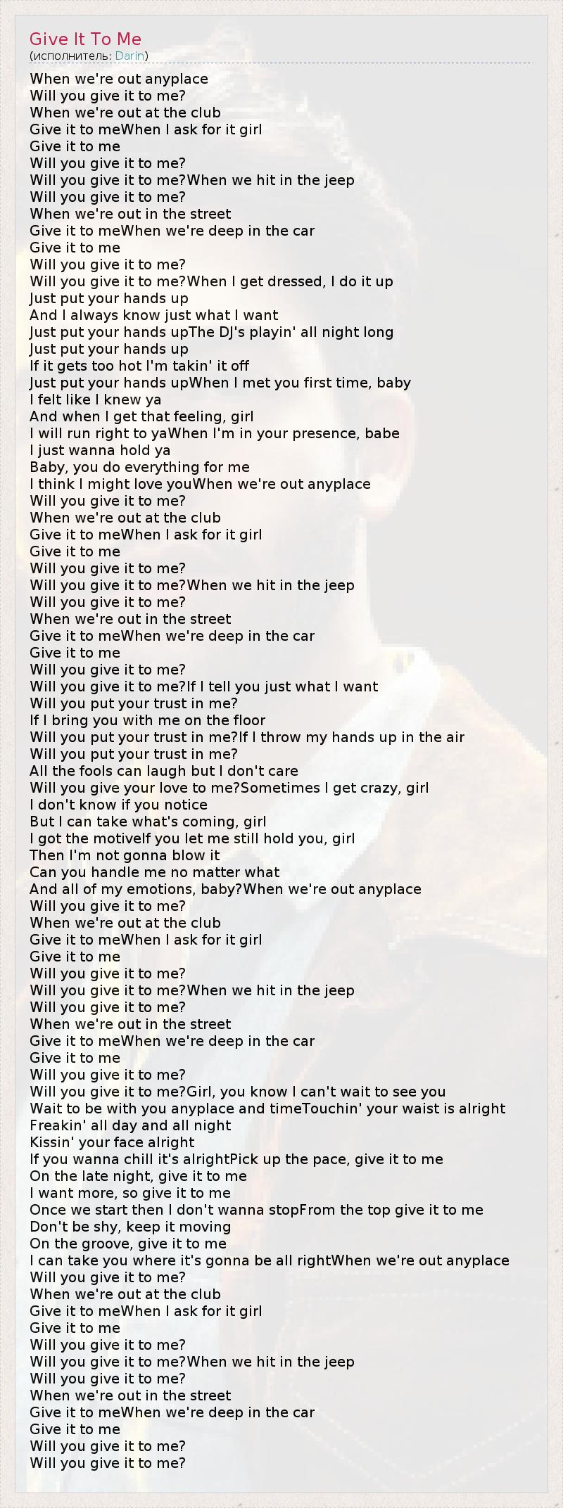 When we're out anyplace Will you give it to me? When we're out at the club Give it to meWhen I ask for it girl Give it to me Will you give it to me? Will you give it to me?When we hit in the jeep Will you give it to me? When we're out in the street Give it to meWhen we're deep in the car Give it to me Will you give it to me? Will you give it to me?When I get dressed, I do it up Just put your hands up And I always know just what I want Just put your hands upThe DJ's playin' all night long Just put your hands up If it gets too hot I'm takin' it off Just put your hands upWhen I met you first time, baby I felt like I knew ya And when I get that feeling, girl I will run right to yaWhen I'm in your presence, babe I just wanna hold ya Baby, you do everything for me I think I might love youWhen we're out anyplace Will you give it to me? When we're out at the club Give it to meWhen I ask for it girl Give it to me Will you give it to me? Will you give it to me?When we hit in the jeep Will you give it to me? When we're out in the street Give it to meWhen we're deep in the car Give it to me Will you give it to me? Will you give it to me?If I tell you just what I want Will you put your trust in me? If I bring you with me on the floor Will you put your trust in me?If I throw my hands up in the air Will you put your trust in me? All the fools can laugh but I don't care Will you give your love to me?Sometimes I get crazy, girl I don't know if you notice But I can take what's coming, girl I got the motiveIf you let me still hold you, girl Then I'm not gonna blow it Can you handle me no matter what And all of my emotions, baby?When we're out anyplace Will you give it to me? When we're out at the club Give it to meWhen I ask for it girl Give it to me Will you give it to me? Will you give it to me?When we hit in the jeep Will you give it to me? When we're out in the street Give it to meWhen we're deep in the car Give it to me Will you give it to me? Will you give it to me?Girl, you know I can't wait to see you Wait to be with you anyplace and timeTouchin' your waist is alright Freakin' all day and all night Kissin' your face alright If you wanna chill it's alrightPick up the pace, give it to me On the late night, give it to me I want more, so give it to me Once we start then I don't wanna stopFrom the top give it to me Don't be shy, keep it moving On the groove, give it to me I can take you where it's gonna be all rightWhen we're out anyplace Will you give it to me? When we're out at the club Give it to meWhen I ask for it girl Give it to me Will you give it to me? Will you give it to me?When we hit in the jeep Will you give it to me? When we're out in the street Give it to meWhen we're deep in the car Give it to me Will you give it to me? Will you give it to me?