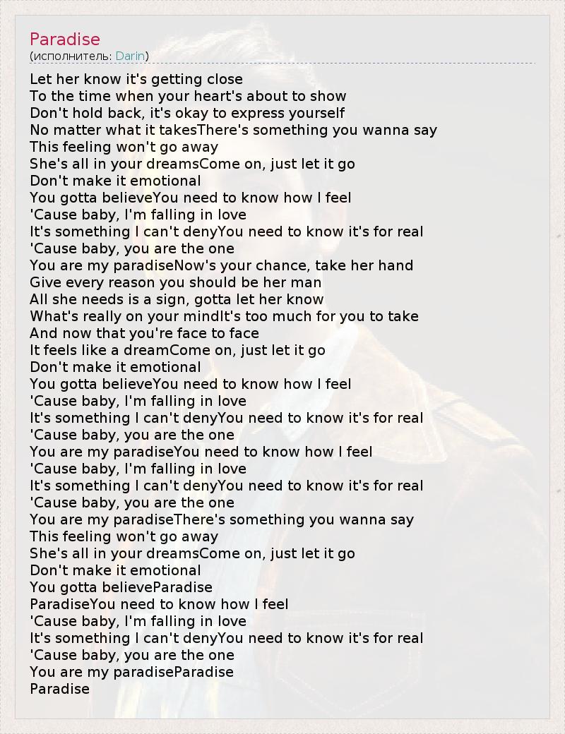 Let her know it's getting close To the time when your heart's about to show Don't hold back, it's okay to express yourself No matter what it takesThere's something you wanna say This feeling won't go away She's all in your dreamsCome on, just let it go Don't make it emotional You gotta believeYou need to know how I feel 'Cause baby, I'm falling in love It's something I can't denyYou need to know it's for real 'Cause baby, you are the one You are my paradiseNow's your chance, take her hand Give every reason you should be her man All she needs is a sign, gotta let her know What's really on your mindIt's too much for you to take And now that you're face to face It feels like a dreamCome on, just let it go Don't make it emotional You gotta believeYou need to know how I feel 'Cause baby, I'm falling in love It's something I can't denyYou need to know it's for real 'Cause baby, you are the one You are my paradiseYou need to know how I feel 'Cause baby, I'm falling in love It's something I can't denyYou need to know it's for real 'Cause baby, you are the one You are my paradiseThere's something you wanna say This feeling won't go away She's all in your dreamsCome on, just let it go Don't make it emotional You gotta believeParadise ParadiseYou need to know how I feel 'Cause baby, I'm falling in love It's something I can't denyYou need to know it's for real 'Cause baby, you are the one You are my paradiseParadise Paradise