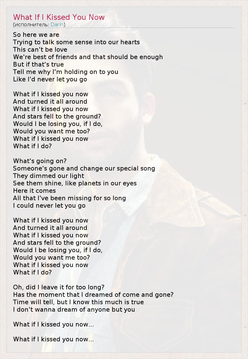 Что ж, вот и мы, Пытаемся разобраться в своих чувствах, Это не может быть любовью, Мы лучшие друзья, и этого должно быть достаточно, Но если это правда.. Скажи, почему тогда я тебя обнимаю, Будто не отпущу никогда... Что, если я тебя сейчас поцелую И всё изменю, Что, если я поцелую тебя сейчас, И начнется звездопад? Потеряю ли я тебя, если сделаю это? Захочешь ли ты поцеловать меня в ответ? Что, если я поцелую тебя? Что, если я это сделаю? Что же происходит? Кто-то ушел и изменил наш романс, Приглушил свет Планет, блестящих в наших глазах, И вот наступает момент, Что я так долго ждал, Я никогда не отпущу тебя.. Что, если я тебя сейчас поцелую И всё изменю, Что, если я поцелую тебя сейчас, И начнется звездопад? Потеряю ли я тебя, если сделаю это? Захочешь ли ты поцеловать меня в ответ? Что, если я поцелую тебя? Что, если я это сделаю? О, я слишком долго это откладывал? Упустил ли я момент, о котором мечтал? Время покажет, но я знаю, что единственно верно - Я не хочу мечтать ни о ком, кроме тебя Что будет, если я поцелую тебя? Что, если я поцелую тебя сейчас?..