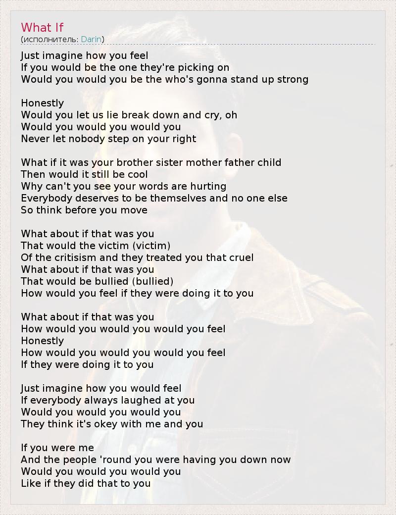 Просто представь, как бы ты себя чувствовала, Если бы это тебя все дразнили? Ты бы повела себя, как сильный человек? Скажи честно, Ты бы действительно позволила нам сломаться и довела бы до слез? А ты, а ты, а ты Позволила бы кому-нибудь ущемлять твои права? А если бы это был твой брат, мать, отец или твой ребенок? Это было бы для тебя так же круто? Как ты не понимаешь, что твои слова больно ранят? Каждый человек имеет право быть собой, а не кем-то еще, Так что в следующий раз подумай, прежде чем что-то сделать. А что, если это была бы ты? Если бы ты оказалась жертвой Всеобщей критики, и с тобой бы обращались так жестоко? А что, если это ты оказалась бы Тем человеком, которого бы все травили? Как бы ты себя чувствовала, если бы они вели себя так с тобой? А что, если это была бы ты? Как бы ты себя чувствовала? Скажи честно, Как бы ты себя чувствовала, Если бы так поступали с тобой? Просто представь, как бы ты себя чувствовала, Если бы все всегда над тобой смеялись? Ты бы, ты бы, ты бы... Ведь все думают: то, что ты делаешь со мной – нормально. Будь ты на моем месте, И люди вокруг наслаждались бы тем, как тебе плохо, Тебе бы, тебе бы, тебе бы Понравилось, если бы так поступали с тобой?