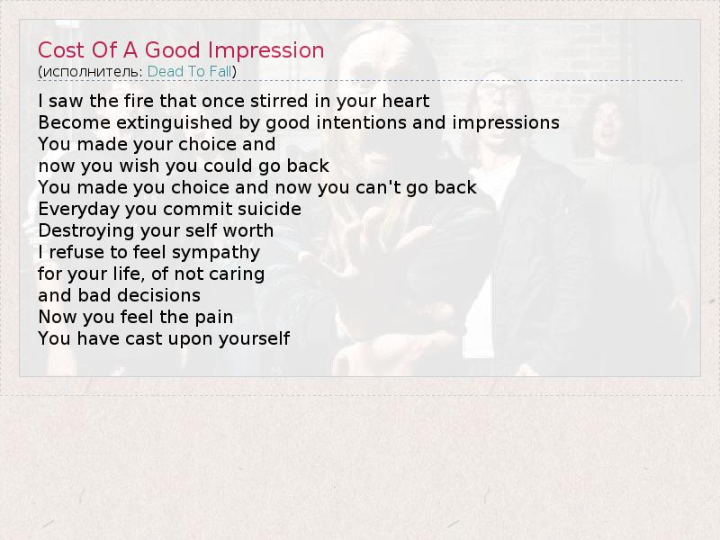 А как ты думаешь, о чем песня "Cost Of A Good Impression" ?