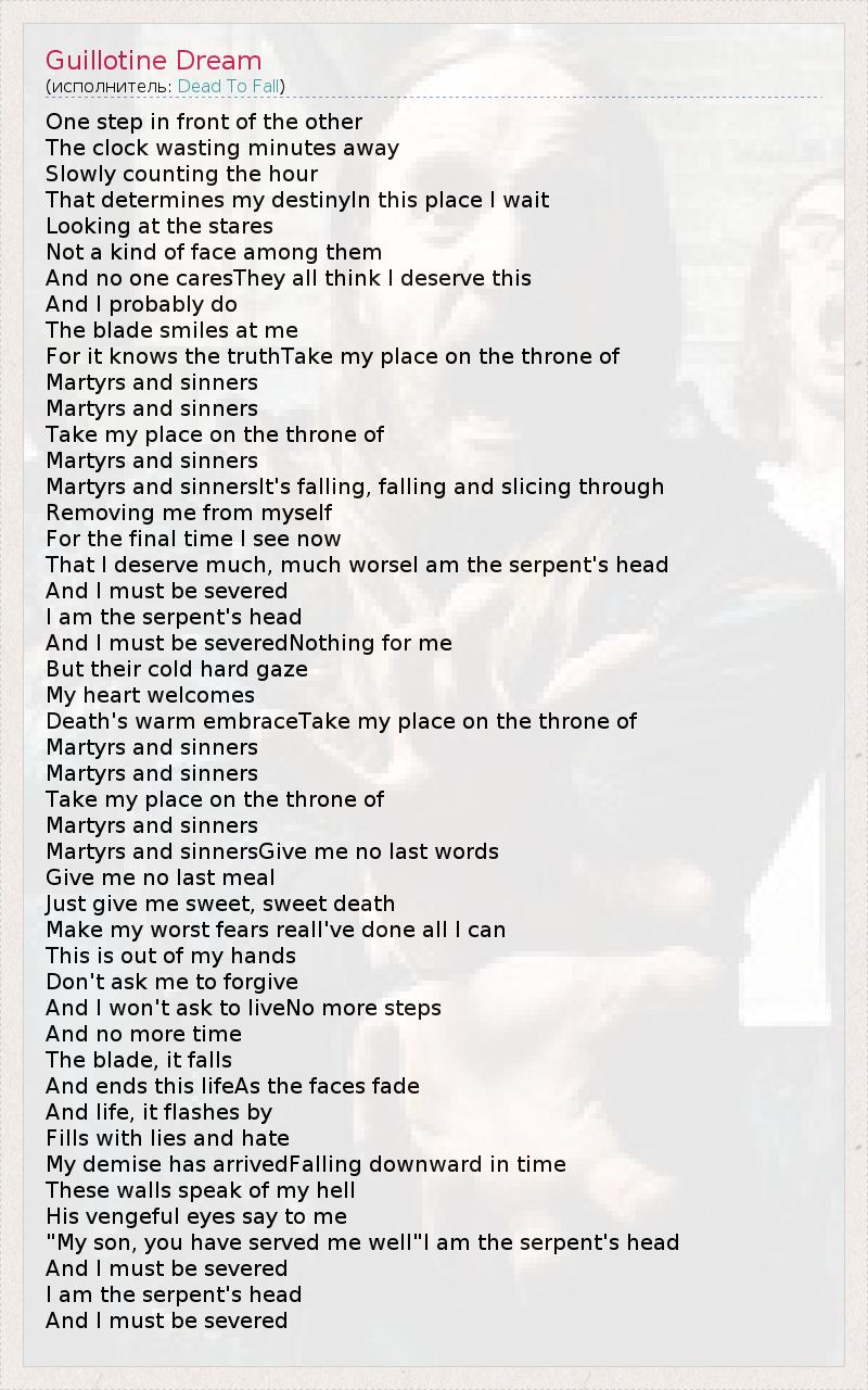 One step in front of the other The clock wasting minutes away Slowly counting the hour That determines my destinyIn this place I wait Looking at the stares Not a kind of face among them And no one caresThey all think I deserve this And I probably do The blade smiles at me For it knows the truthTake my place on the throne of Martyrs and sinners Martyrs and sinners Take my place on the throne of Martyrs and sinners Martyrs and sinnersIt's falling, falling and slicing through Removing me from myself For the final time I see now That I deserve much, much worseI am the serpent's head And I must be severed I am the serpent's head And I must be severedNothing for me But their cold hard gaze My heart welcomes Death's warm embraceTake my place on the throne of Martyrs and sinners Martyrs and sinners Take my place on the throne of Martyrs and sinners Martyrs and sinnersGive me no last words Give me no last meal Just give me sweet, sweet death Make my worst fears realI've done all I can This is out of my hands Don't ask me to forgive And I won't ask to liveNo more steps And no more time The blade, it falls And ends this lifeAs the faces fade And life, it flashes by Fills with lies and hate My demise has arrivedFalling downward in time These walls speak of my hell His vengeful eyes say to me "My son, you have served me well"I am the serpent's head And I must be severed I am the serpent's head And I must be severed