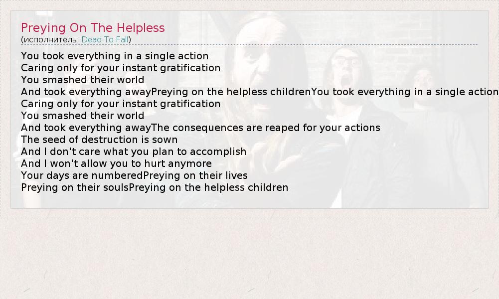 А как ты думаешь, о чем песня "Preying On The Helpless" ?