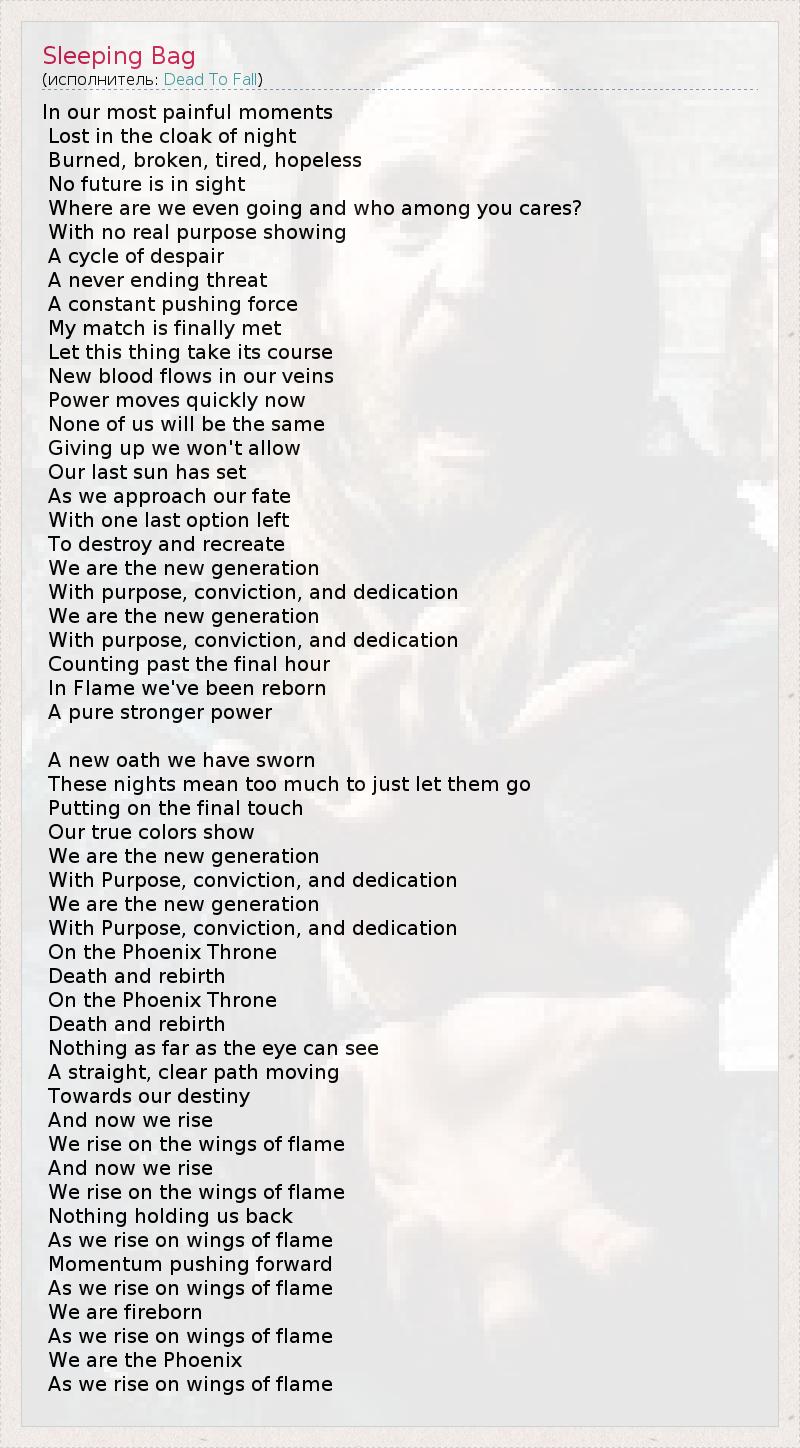 In our most painful moments Lost in the cloak of night Burned, broken, tired, hopeless No future is in sight Where are we even going and who among you cares? With no real purpose showing A cycle of despair A never ending threat A constant pushing force My match is finally met Let this thing take its course New blood flows in our veins Power moves quickly now None of us will be the same Giving up we won't allow Our last sun has set As we approach our fate With one last option left To destroy and recreate We are the new generation With purpose, conviction, and dedication We are the new generation With purpose, conviction, and dedication Counting past the final hour In Flame we've been reborn A pure stronger power A new oath we have sworn These nights mean too much to just let them go Putting on the final touch Our true colors show We are the new generation With Purpose, conviction, and dedication We are the new generation With Purpose, conviction, and dedication On the Phoenix Throne Death and rebirth On the Phoenix Throne Death and rebirth Nothing as far as the eye can see A straight, clear path moving Towards our destiny And now we rise We rise on the wings of flame And now we rise We rise on the wings of flame Nothing holding us back As we rise on wings of flame Momentum pushing forward As we rise on wings of flame We are fireborn As we rise on wings of flame We are the Phoenix As we rise on wings of flame