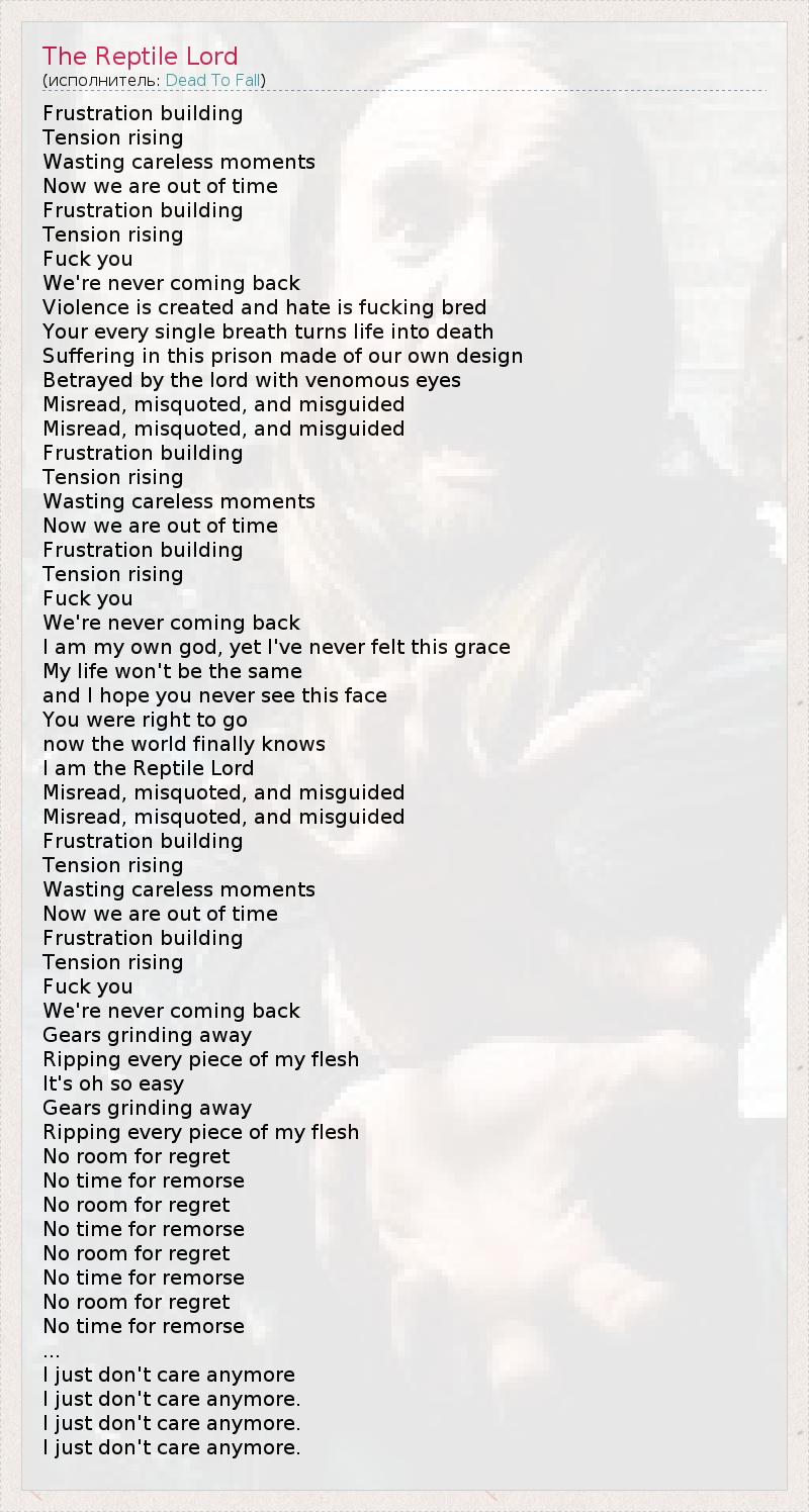 Frustration building Tension rising Wasting careless moments Now we are out of time Frustration building Tension rising Fuck you We're never coming back Violence is created and hate is fucking bred Your every single breath turns life into death Suffering in this prison made of our own design Betrayed by the lord with venomous eyes Misread, misquoted, and misguided Misread, misquoted, and misguided Frustration building Tension rising Wasting careless moments Now we are out of time Frustration building Tension rising Fuck you We're never coming back I am my own god, yet I've never felt this grace My life won't be the same and I hope you never see this face You were right to go now the world finally knows I am the Reptile Lord Misread, misquoted, and misguided Misread, misquoted, and misguided Frustration building Tension rising Wasting careless moments Now we are out of time Frustration building Tension rising Fuck you We're never coming back Gears grinding away Ripping every piece of my flesh It's oh so easy Gears grinding away Ripping every piece of my flesh No room for regret No time for remorse No room for regret No time for remorse No room for regret No time for remorse No room for regret No time for remorse ... I just don't care anymore I just don't care anymore. I just don't care anymore. I just don't care anymore.