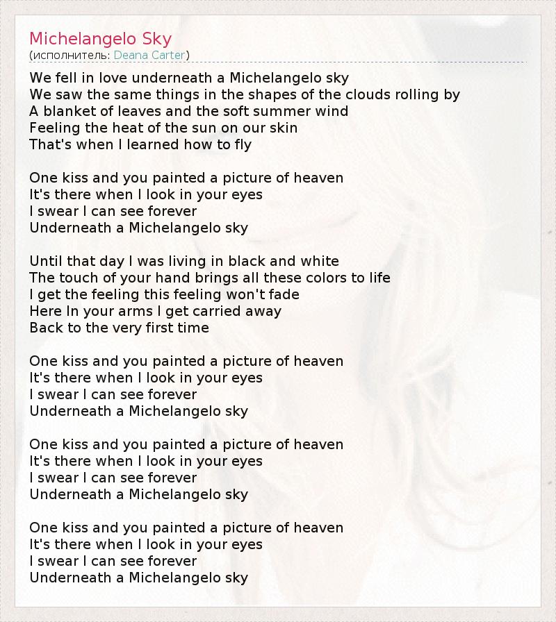 We fell in love underneath a Michelangelo sky We saw the same things in the shapes of the clouds rolling by A blanket of leaves and the soft summer wind Feeling the heat of the sun on our skin That's when I learned how to fly One kiss and you painted a picture of heaven It's there when I look in your eyes I swear I can see forever Underneath a Michelangelo sky Until that day I was living in black and white The touch of your hand brings all these colors to life I get the feeling this feeling won't fade Here In your arms I get carried away Back to the very first time One kiss and you painted a picture of heaven It's there when I look in your eyes I swear I can see forever Underneath a Michelangelo sky One kiss and you painted a picture of heaven It's there when I look in your eyes I swear I can see forever Underneath a Michelangelo sky One kiss and you painted a picture of heaven It's there when I look in your eyes I swear I can see forever Underneath a Michelangelo sky