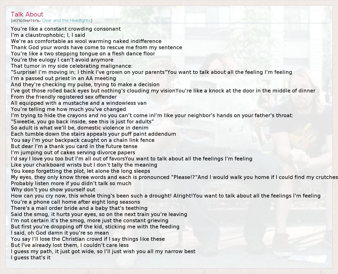 You're like a constant crowding consonant I'm a claustrophobic; I, I said We're as comfortable as wool warming naked indifference Thank God your words have come to rescue me from my sentence You're like a two stepping tongue on a flesh dance floor You're the eulogy I can't avoid anymore That tumor in my side celebrating malignance: "Surprise! I'm moving in; I think I've grown on your parents"You want to talk about all the feeling I'm feeling I'm a passed out priest in an AA meeting And they're checking my pulse, trying to make a decision I've got those rolled back eyes but nothing's clouding my visionYou're like a knock at the door in the middle of dinner From the friendly registered sex offender All equipped with a mustache and a windowless van You're telling me how much you've changed I'm trying to hide the crayons and no you can't come inI'm like your neighbor's hands on your father's throat: "Sweetie, you go back inside, see this is just for adults" So adult is what we'll be, domestic violence in denim Each tumble down the stairs appeals your puff paint addendum You say I'm your backpack caught on a chain link fence But dear I'm a thank you card in the future tense I'm jumping out of cakes serving divorce papers I'd say I love you too but I'm all out of favorsYou want to talk about all the feelings I'm feeling Like your chalkboard wrists but I don't tally the meaning You keep forgetting the plot, let alone the long sleeps My eyes, they only know three words and each is pronounced "Please!?"And I would walk you home if I could find my crutches Probably listen more if you didn't talk so much Why don't you show yourself out How can you cry now, this whole thing's been such a drought! Alright!You want to talk about all the feelings I'm feeling You're a phone call home after eight long seasons There's a mail order bride and a baby that's teething Said the smog, it hurts your eyes, so on the next train you're leaving I'm not certain it's the smog, more just the constant grieving But first you're dropping off the kid, sticking me with the feeding I said, oh God damn it you're so mean You say I'll lose the Christian crowd if I say things like these But I've already lost them, I couldn't care less I guess my path, it just got wide, so I'll just wish you all my narrow best I guess that's it