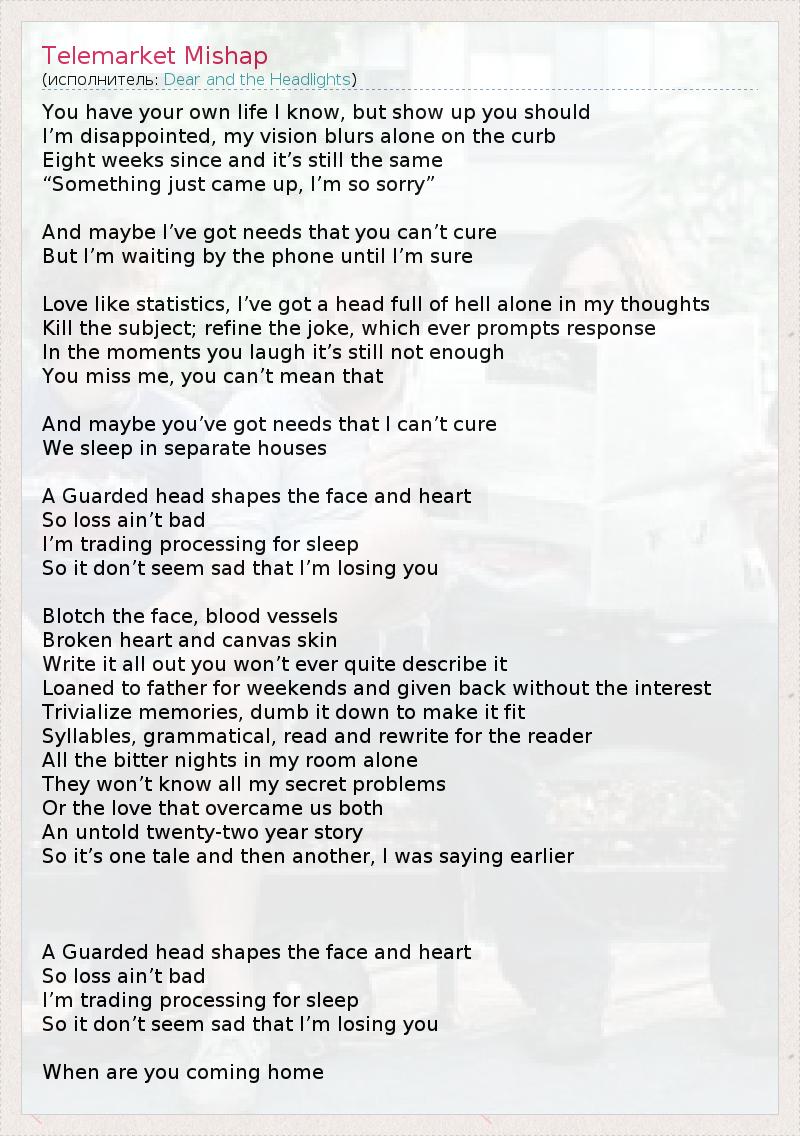 You have your own life I know, but show up you should I’m disappointed, my vision blurs alone on the curb Eight weeks since and it’s still the same “Something just came up, I’m so sorry” And maybe I’ve got needs that you can’t cure But I’m waiting by the phone until I’m sure Love like statistics, I’ve got a head full of hell alone in my thoughts Kill the subject; refine the joke, which ever prompts response In the moments you laugh it’s still not enough You miss me, you can’t mean that And maybe you’ve got needs that I can’t cure We sleep in separate houses A Guarded head shapes the face and heart So loss ain’t bad I’m trading processing for sleep So it don’t seem sad that I’m losing you Blotch the face, blood vessels Broken heart and canvas skin Write it all out you won’t ever quite describe it Loaned to father for weekends and given back without the interest Trivialize memories, dumb it down to make it fit Syllables, grammatical, read and rewrite for the reader All the bitter nights in my room alone They won’t know all my secret problems Or the love that overcame us both An untold twenty-two year story So it’s one tale and then another, I was saying earlier A Guarded head shapes the face and heart So loss ain’t bad I’m trading processing for sleep So it don’t seem sad that I’m losing you When are you coming home