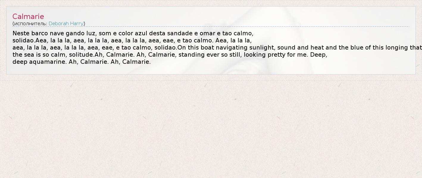 Neste barco nave gando luz, som e color azul desta sandade e omar e tao calmo, solidao.Aea, la la la, aea, la la la, aea, la la la, aea, eae, e tao calmo. Aea, la la la, aea, la la la, aea, la la la, aea, eae, e tao calmo, solidao.On this boat navigating sunlight, sound and heat and the blue of this longing that the sea is so calm, solitude.Ah, Calmarie. Ah, Calmarie, standing ever so still, looking pretty for me. Deep, deep aquamarine. Ah, Calmarie. Ah, Calmarie.