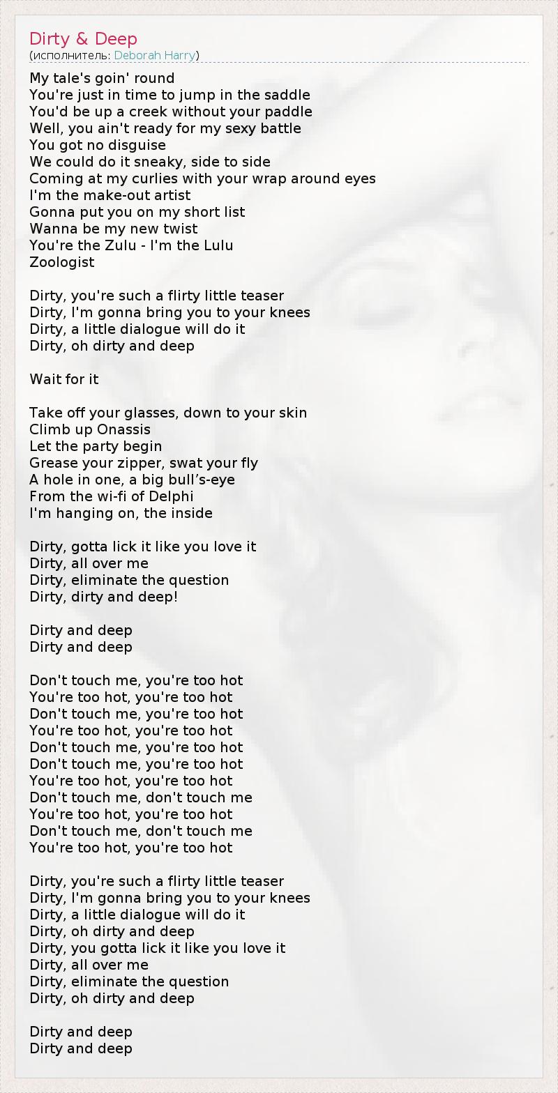 My tale's goin' round You're just in time to jump in the saddle You'd be up a creek without your paddle Well, you ain't ready for my sexy battle You got no disguise We could do it sneaky, side to side Coming at my curlies with your wrap around eyes I'm the make-out artist Gonna put you on my short list Wanna be my new twist You're the Zulu - I'm the Lulu Zoologist Dirty, you're such a flirty little teaser Dirty, I'm gonna bring you to your knees Dirty, a little dialogue will do it Dirty, oh dirty and deep Wait for it Take off your glasses, down to your skin Climb up Onassis Let the party begin Grease your zipper, swat your fly A hole in one, a big bull’s-eye From the wi-fi of Delphi I'm hanging on, the inside Dirty, gotta lick it like you love it Dirty, all over me Dirty, eliminate the question Dirty, dirty and deep! Dirty and deep Dirty and deep Don't touch me, you're too hot You're too hot, you're too hot Don't touch me, you're too hot You're too hot, you're too hot Don't touch me, you're too hot Don't touch me, you're too hot You're too hot, you're too hot Don't touch me, don't touch me You're too hot, you're too hot Don't touch me, don't touch me You're too hot, you're too hot Dirty, you're such a flirty little teaser Dirty, I'm gonna bring you to your knees Dirty, a little dialogue will do it Dirty, oh dirty and deep Dirty, you gotta lick it like you love it Dirty, all over me Dirty, eliminate the question Dirty, oh dirty and deep Dirty and deep Dirty and deep