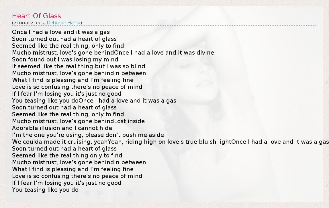 Once I had a love and it was a gas Soon turned out had a heart of glass Seemed like the real thing, only to find Mucho mistrust, love's gone behindOnce I had a love and it was divine Soon found out I was losing my mind It seemed like the real thing but I was so blind Mucho mistrust, love's gone behindIn between What I find is pleasing and I'm feeling fine Love is so confusing there's no peace of mind If I fear I'm losing you it's just no good You teasing like you doOnce I had a love and it was a gas Soon turned out had a heart of glass Seemed like the real thing, only to find Mucho mistrust, love's gone behindLost inside Adorable illusion and I cannot hide I'm the one you're using, please don't push me aside We coulda made it cruising, yeahYeah, riding high on love's true bluish lightOnce I had a love and it was a gas Soon turned out had a heart of glass Seemed like the real thing only to find Mucho mistrust, love's gone behindIn between What I find is pleasing and I'm feeling fine Love is so confusing there's no peace of mind If I fear I'm losing you it's just no good You teasing like you do