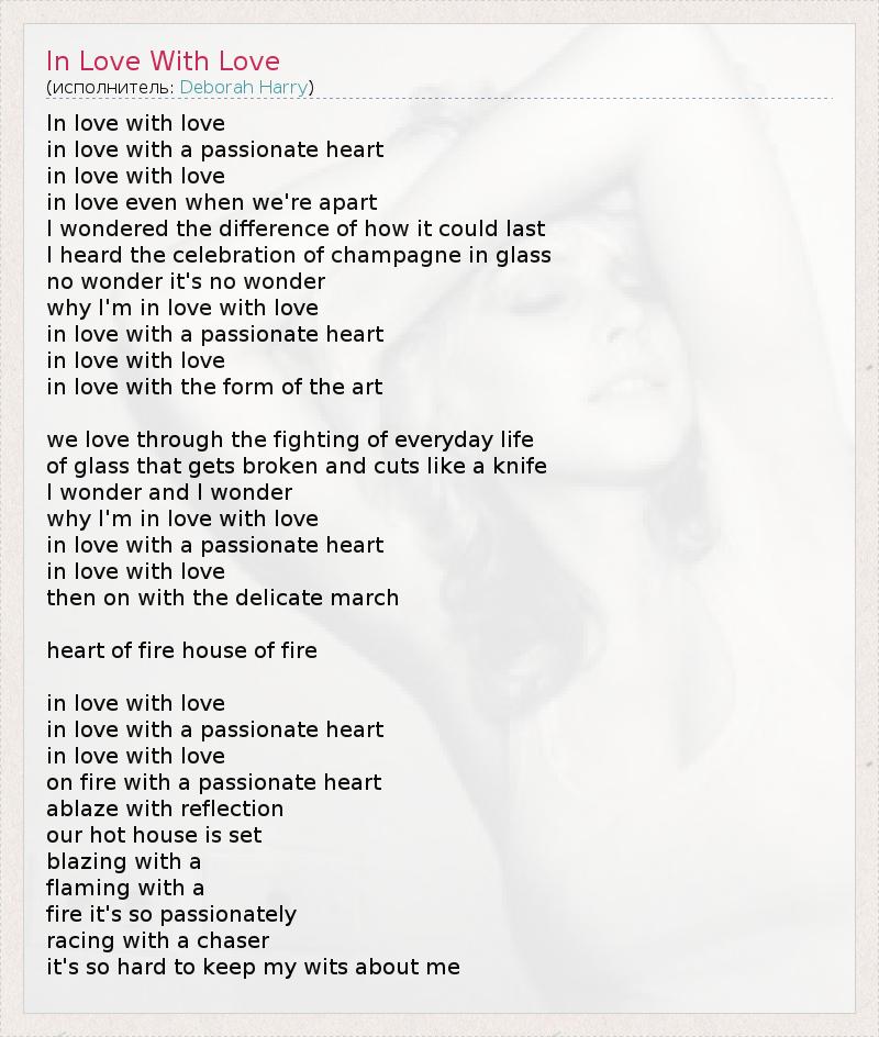 In love with love in love with a passionate heart in love with love in love even when we're apart I wondered the difference of how it could last I heard the celebration of champagne in glass no wonder it's no wonder why I'm in love with love in love with a passionate heart in love with love in love with the form of the art we love through the fighting of everyday life of glass that gets broken and cuts like a knife I wonder and I wonder why I'm in love with love in love with a passionate heart in love with love then on with the delicate march heart of fire house of fire in love with love in love with a passionate heart in love with love on fire with a passionate heart ablaze with reflection our hot house is set blazing with a flaming with a fire it's so passionately racing with a chaser it's so hard to keep my wits about me