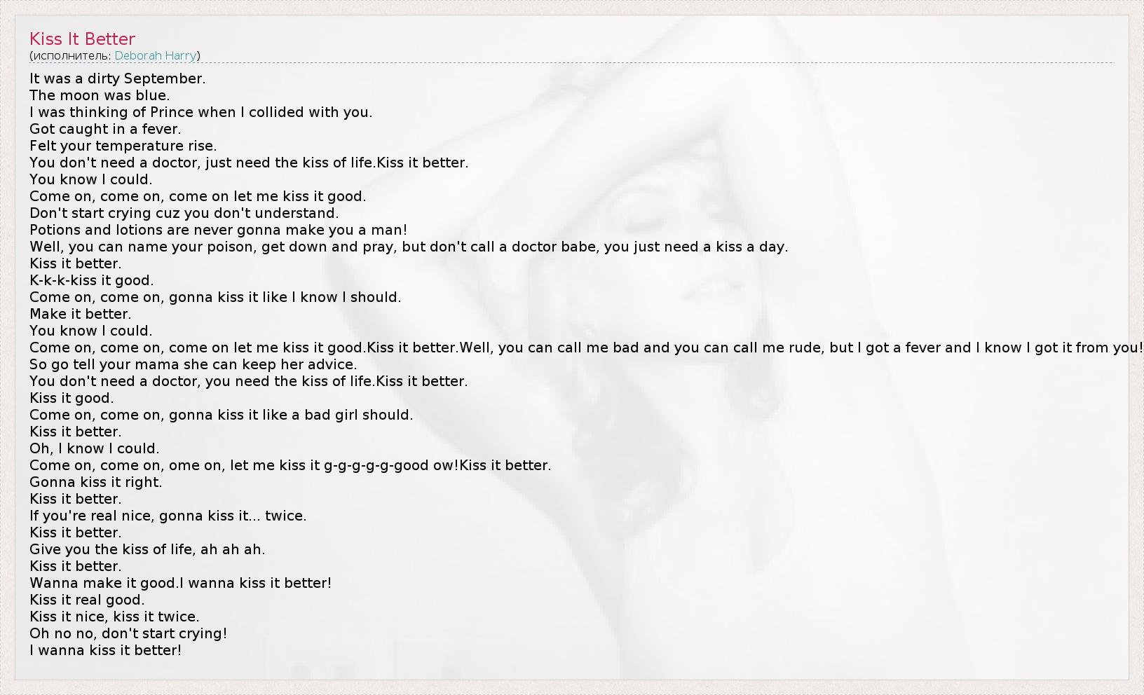 It was a dirty September. The moon was blue. I was thinking of Prince when I collided with you. Got caught in a fever. Felt your temperature rise. You don't need a doctor, just need the kiss of life.Kiss it better. You know I could. Come on, come on, come on let me kiss it good. Don't start crying cuz you don't understand. Potions and lotions are never gonna make you a man! Well, you can name your poison, get down and pray, but don't call a doctor babe, you just need a kiss a day. Kiss it better. K-k-k-kiss it good. Come on, come on, gonna kiss it like I know I should. Make it better. You know I could. Come on, come on, come on let me kiss it good.Kiss it better.Well, you can call me bad and you can call me rude, but I got a fever and I know I got it from you! So go tell your mama she can keep her advice. You don't need a doctor, you need the kiss of life.Kiss it better. Kiss it good. Come on, come on, gonna kiss it like a bad girl should. Kiss it better. Oh, I know I could. Come on, come on, ome on, let me kiss it g-g-g-g-g-good ow!Kiss it better. Gonna kiss it right. Kiss it better. If you're real nice, gonna kiss it... twice. Kiss it better. Give you the kiss of life, ah ah ah. Kiss it better. Wanna make it good.I wanna kiss it better! Kiss it real good. Kiss it nice, kiss it twice. Oh no no, don't start crying! I wanna kiss it better!