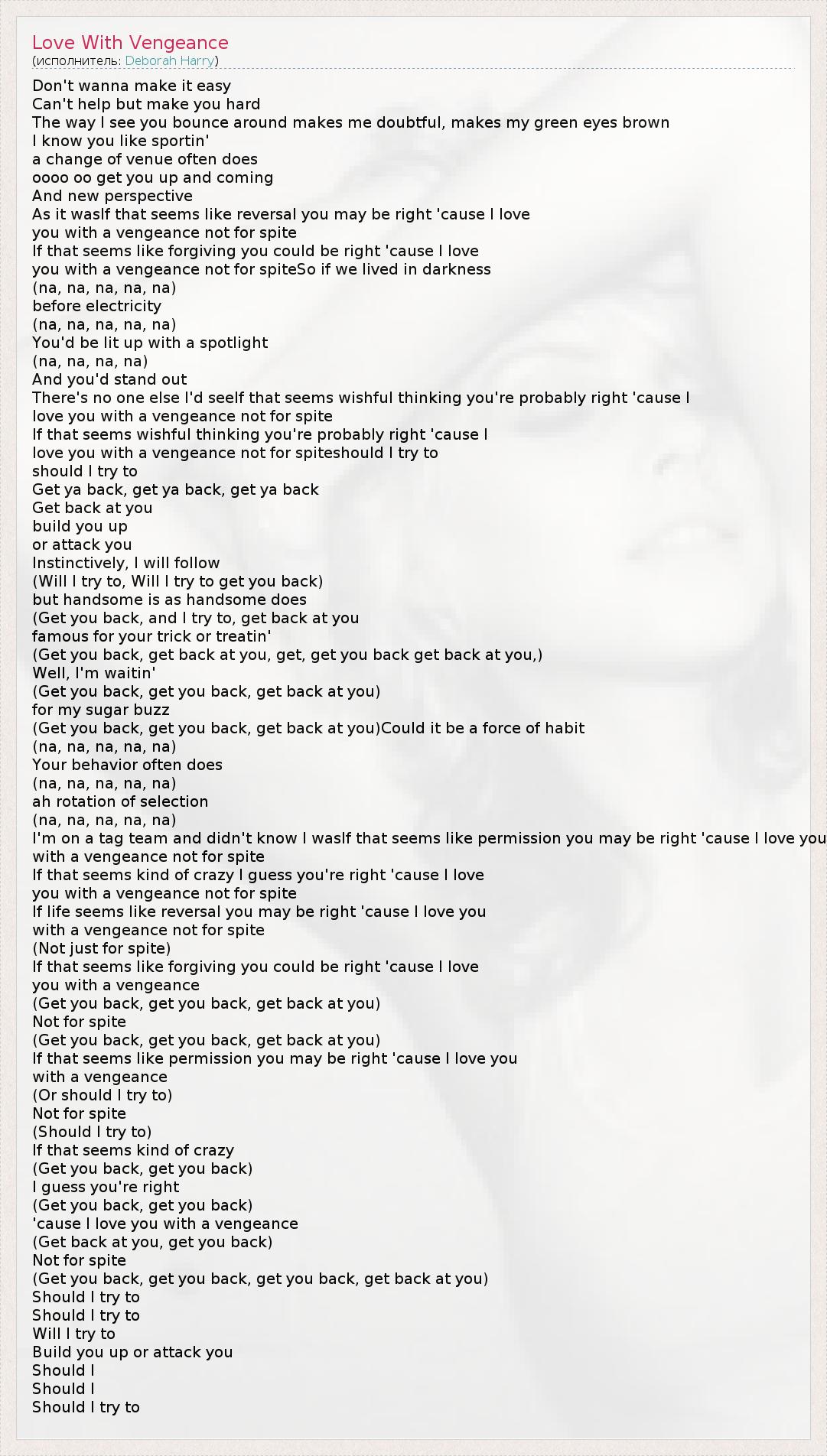 Don't wanna make it easy Can't help but make you hard The way I see you bounce around makes me doubtful, makes my green eyes brown I know you like sportin' a change of venue often does oooo oo get you up and coming And new perspective As it wasIf that seems like reversal you may be right 'cause I love you with a vengeance not for spite If that seems like forgiving you could be right 'cause I love you with a vengeance not for spiteSo if we lived in darkness (na, na, na, na, na) before electricity (na, na, na, na, na) You'd be lit up with a spotlight (na, na, na, na) And you'd stand out There's no one else I'd seeIf that seems wishful thinking you're probably right 'cause I love you with a vengeance not for spite If that seems wishful thinking you're probably right 'cause I love you with a vengeance not for spiteshould I try to should I try to Get ya back, get ya back, get ya back Get back at you build you up or attack you Instinctively, I will follow (Will I try to, Will I try to get you back) but handsome is as handsome does (Get you back, and I try to, get back at you famous for your trick or treatin' (Get you back, get back at you, get, get you back get back at you,) Well, I'm waitin' (Get you back, get you back, get back at you) for my sugar buzz (Get you back, get you back, get back at you)Could it be a force of habit (na, na, na, na, na) Your behavior often does (na, na, na, na, na) ah rotation of selection (na, na, na, na, na) I'm on a tag team and didn't know I wasIf that seems like permission you may be right 'cause I love you with a vengeance not for spite If that seems kind of crazy I guess you're right 'cause I love you with a vengeance not for spite If life seems like reversal you may be right 'cause I love you with a vengeance not for spite (Not just for spite) If that seems like forgiving you could be right 'cause I love you with a vengeance (Get you back, get you back, get back at you) Not for spite (Get you back, get you back, get back at you) If that seems like permission you may be right 'cause I love you with a vengeance (Or should I try to) Not for spite (Should I try to) If that seems kind of crazy (Get you back, get you back) I guess you're right (Get you back, get you back) 'cause I love you with a vengeance (Get back at you, get you back) Not for spite (Get you back, get you back, get you back, get back at you) Should I try to Should I try to Will I try to Build you up or attack you Should I Should I Should I try to