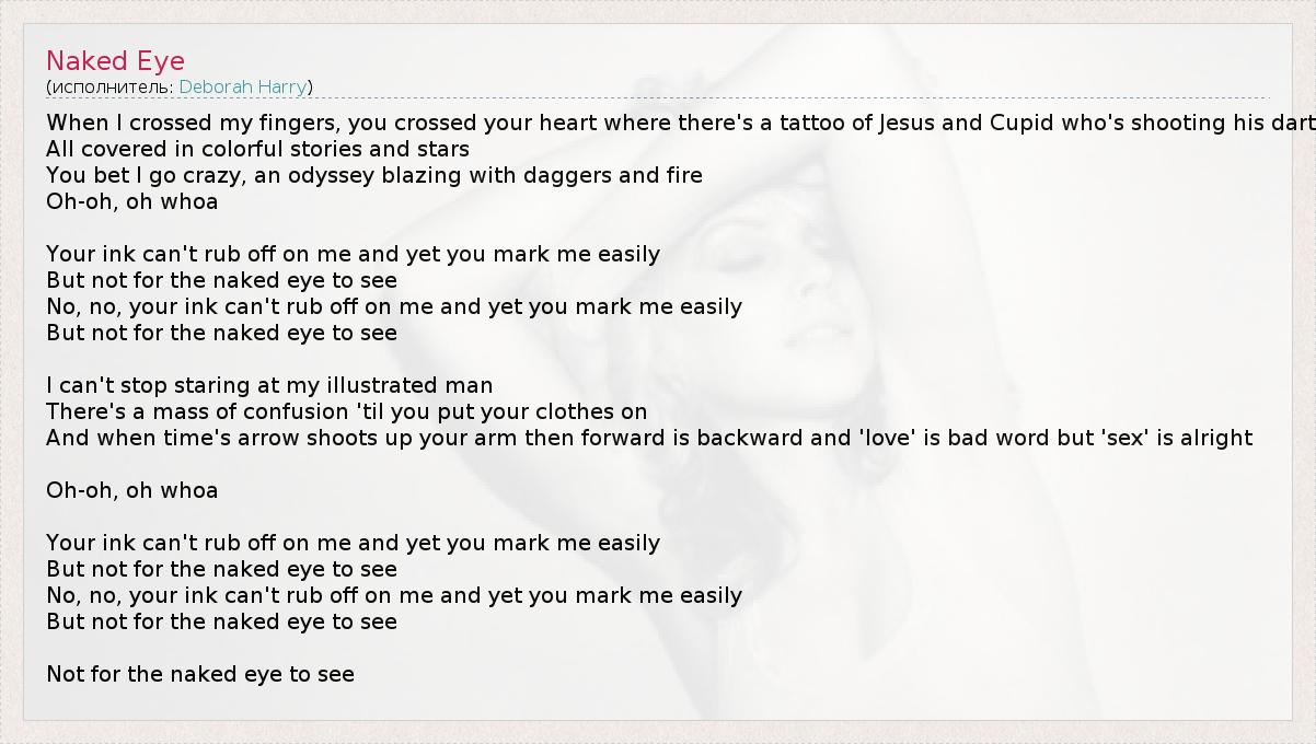 When I crossed my fingers, you crossed your heart where there's a tattoo of Jesus and Cupid who's shooting his dart All covered in colorful stories and stars You bet I go crazy, an odyssey blazing with daggers and fire Oh-oh, oh whoa Your ink can't rub off on me and yet you mark me easily But not for the naked eye to see No, no, your ink can't rub off on me and yet you mark me easily But not for the naked eye to see I can't stop staring at my illustrated man There's a mass of confusion 'til you put your clothes on And when time's arrow shoots up your arm then forward is backward and 'love' is bad word but 'sex' is alright Oh-oh, oh whoa Your ink can't rub off on me and yet you mark me easily But not for the naked eye to see No, no, your ink can't rub off on me and yet you mark me easily But not for the naked eye to see Not for the naked eye to see