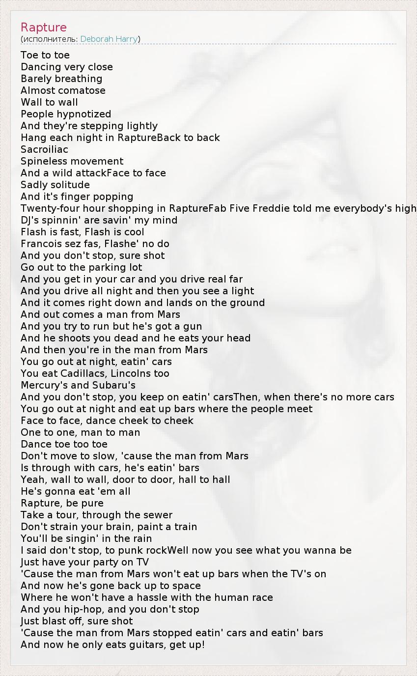 Toe to toe Dancing very close Barely breathing Almost comatose Wall to wall People hypnotized And they're stepping lightly Hang each night in RaptureBack to back Sacroiliac Spineless movement And a wild attackFace to face Sadly solitude And it's finger popping Twenty-four hour shopping in RaptureFab Five Freddie told me everybody's high DJ's spinnin' are savin' my mind Flash is fast, Flash is cool Francois sez fas, Flashe' no do And you don't stop, sure shot Go out to the parking lot And you get in your car and you drive real far And you drive all night and then you see a light And it comes right down and lands on the ground And out comes a man from Mars And you try to run but he's got a gun And he shoots you dead and he eats your head And then you're in the man from Mars You go out at night, eatin' cars You eat Cadillacs, Lincolns too Mercury's and Subaru's And you don't stop, you keep on eatin' carsThen, when there's no more cars You go out at night and eat up bars where the people meet Face to face, dance cheek to cheek One to one, man to man Dance toe too toe Don't move to slow, 'cause the man from Mars Is through with cars, he's eatin' bars Yeah, wall to wall, door to door, hall to hall He's gonna eat 'em all Rapture, be pure Take a tour, through the sewer Don't strain your brain, paint a train You'll be singin' in the rain I said don't stop, to punk rockWell now you see what you wanna be Just have your party on TV 'Cause the man from Mars won't eat up bars when the TV's on And now he's gone back up to space Where he won't have a hassle with the human race And you hip-hop, and you don't stop Just blast off, sure shot 'Cause the man from Mars stopped eatin' cars and eatin' bars And now he only eats guitars, get up!