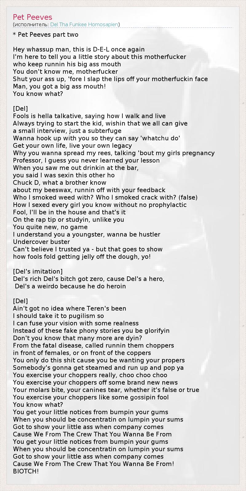 * Pet Peeves part two Hey whassup man, this is D-E-L once again I'm here to tell you a little story about this motherfucker who keep runnin his big ass mouth You don't know me, motherfucker Shut your ass up, 'fore I slap the lips off your motherfuckin face Man, you got a big ass mouth! You know what? [Del] Fools is hella talkative, saying how I walk and live Always trying to start the kid, wishin that we all can give a small interview, just a subterfuge Wanna hook up with you so they can say 'whatchu do' Get your own life, live your own legacy Why you wanna spread my rees, talking 'bout my girls pregnancy Professor, I guess you never learned your lesson When you saw me out drinkin at the bar, you said I was sexin this other ho Chuck D, what a brother know about my beeswax, runnin off with your feedback Who I smoked weed with? Who I smoked crack with? (false) How I sexed every girl you know without no prophylactic Fool, I'll be in the house and that's it On the rap tip or studyin, unlike you You quite new, no game I understand you a youngster, wanna be hustler Undercover buster Can't believe I trusted ya - but that goes to show how fools fold getting jelly off the dough, yo! [Del's imitation] Del's rich Del's bitch got zero, cause Del's a hero, Del's a weirdo because he do heroin [Del] Ain't got no idea where Teren's been I should take it to pugilism so I can fuse your vision with some realness Instead of these fake phony stories you be glorifyin Don't you know that many more are dyin? From the fatal disease, called runnin them choppers in front of females, or on front of the coppers You only do this shit cause you be wanting your propers Somebody's gonna get steamed and run up and pop ya You exercise your choppers really, choo choo choo You exercise your choppers off some brand new news Your molars bite, your canines tear, whether it's false or true You exercise your choppers like some gossipin fool You know what? You get your little notices from bumpin your gums When you should be concentratin on lumpin your sums Got to show your little ass when company comes Cause We From The Crew That You Wanna Be From You get your little notices from bumpin your gums When you should be concentratin on lumpin your sums Got to show your little ass when company comes Cause We From The Crew That You Wanna Be From! BIOTCH!